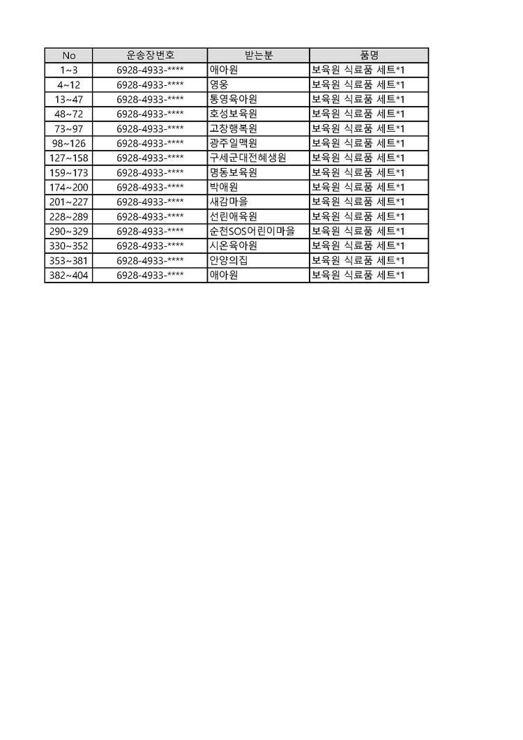 기타 사업비는 행복나눔재단이 부담했습니다. (기부후기 발송시점에 최종 업데이트 됩니다.) 실제 쇼핑몰에서 확인되는 배송현황을 캡처한 내용입니다. 실시간 자료와는 차이가 있을 수 있습니다.