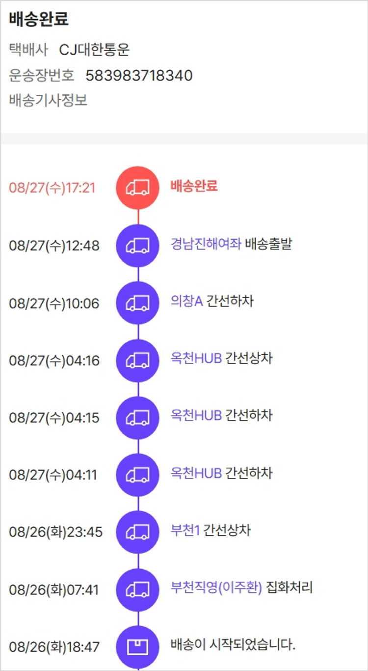 기부자님이 사용한 기부포인트 11,100원, 물품배송비 3,500원, 가격상승분 16,260원, 100원 미만 지원금 84원, 결제 수수료 11,631원, 기타 사업비는 행복나눔재단이 부담했습니다. (기부후기 발송시점에 최종 업데이트 됩니다.) 실제 쇼핑몰에서 확인되는 배송현황을 캡처한 내용입니다. 실시간 자료와는 차이가 있을 수 있습니다.