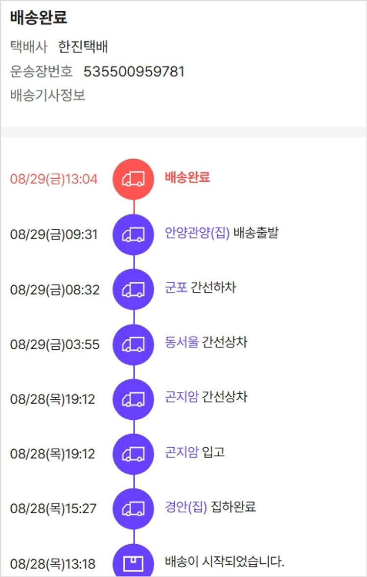 기부자님이 사용한 기부포인트 15,500원, 물품배송비 3,000원, 가격상승분 13,680원, 100원 미만 지원금 60원, 결제 수수료 11,669원, 기타 사업비는 행복나눔재단이 부담했습니다. (기부후기 발송시점에 최종 업데이트 됩니다.) 실제 쇼핑몰에서 확인되는 배송현황을 캡처한 내용입니다. 실시간 자료와는 차이가 있을 수 있습니다.