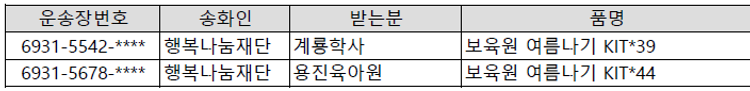 기부자님이 사용한 기부포인트 7,850원, 결제 수수료 287,898원, 기타 사업비는 행복나눔재단이 부담했습니다. (기부후기 발송시점에 최종 업데이트 됩니다.) 실제 쇼핑몰에서 확인되는 배송현황을 캡처한 내용입니다. 실시간 자료와는 차이가 있을 수 있습니다.