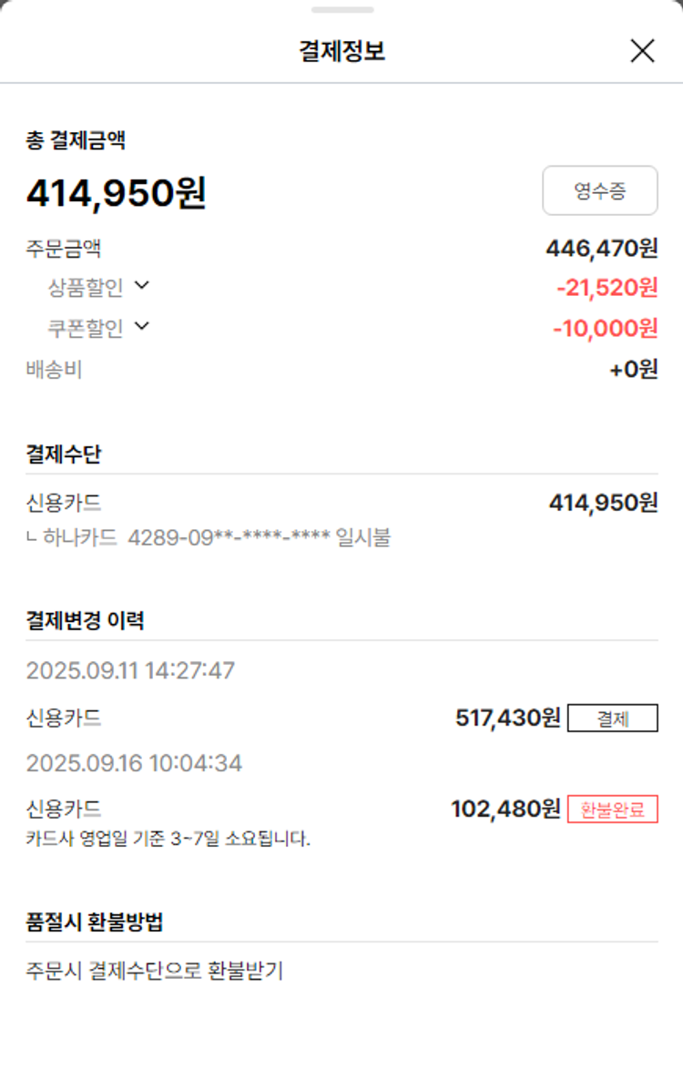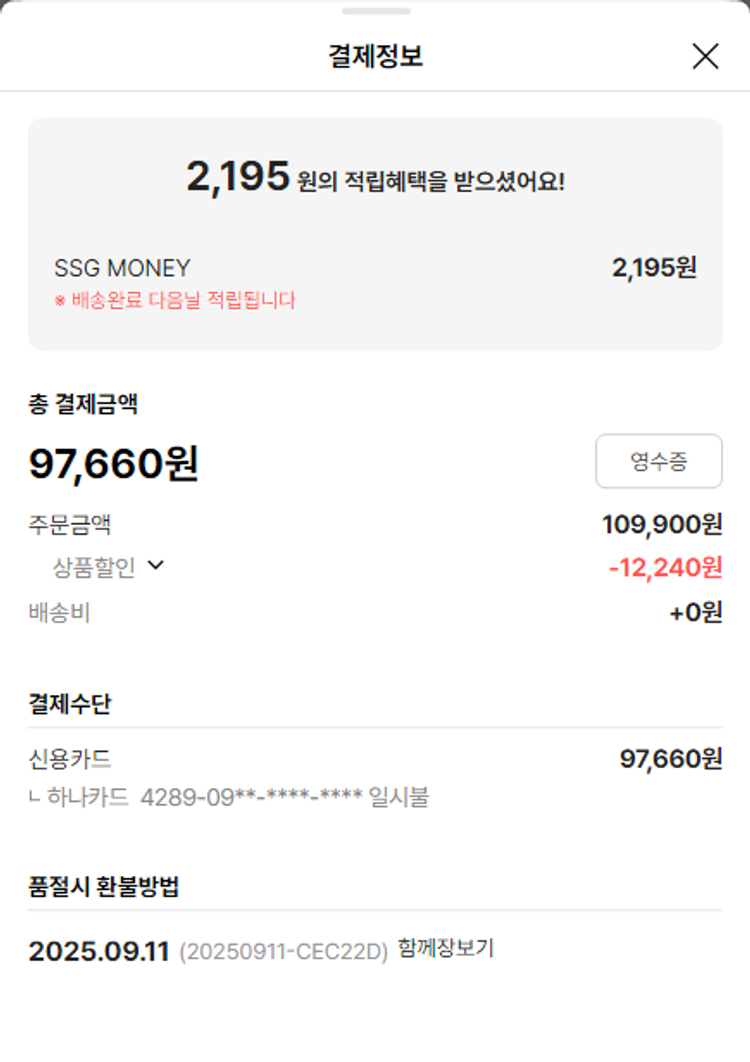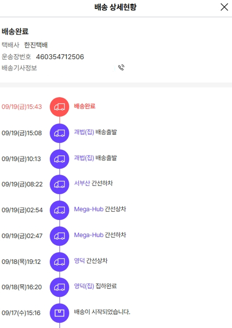 가격상승분 12,532원, 100원 미만 지원금 78원, 기타 사업비는 행복나눔재단이 부담했습니다. (기부후기 발송시점에 최종 업데이트 됩니다.) 상품 주문 건 중 품절 발생하여 2025-09-16 재주문하였습니다. 실제 쇼핑몰에서 확인되는 배송현황을 캡처한 내용입니다. 실시간 자료와는 차이가 있을 수 있습니다.