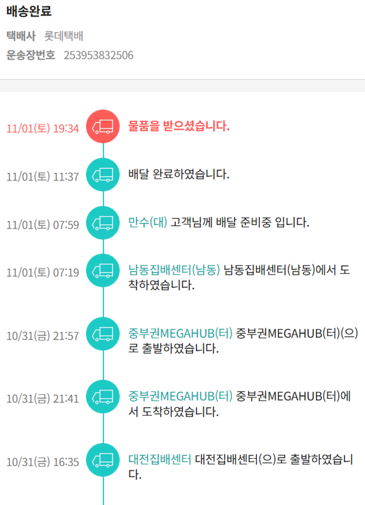 가격상승분 13,380원, 기타 사업비는 행복나눔재단이 부담했습니다. (기부후기 발송시점에 최종 업데이트 됩니다.) 상품 주문 건 중 품절 발생하여 2025-10-30 재주문하였습니다. 실제 쇼핑몰에서 확인되는 배송현황을 캡처한 내용입니다. 실시간 자료와는 차이가 있을 수 있습니다.