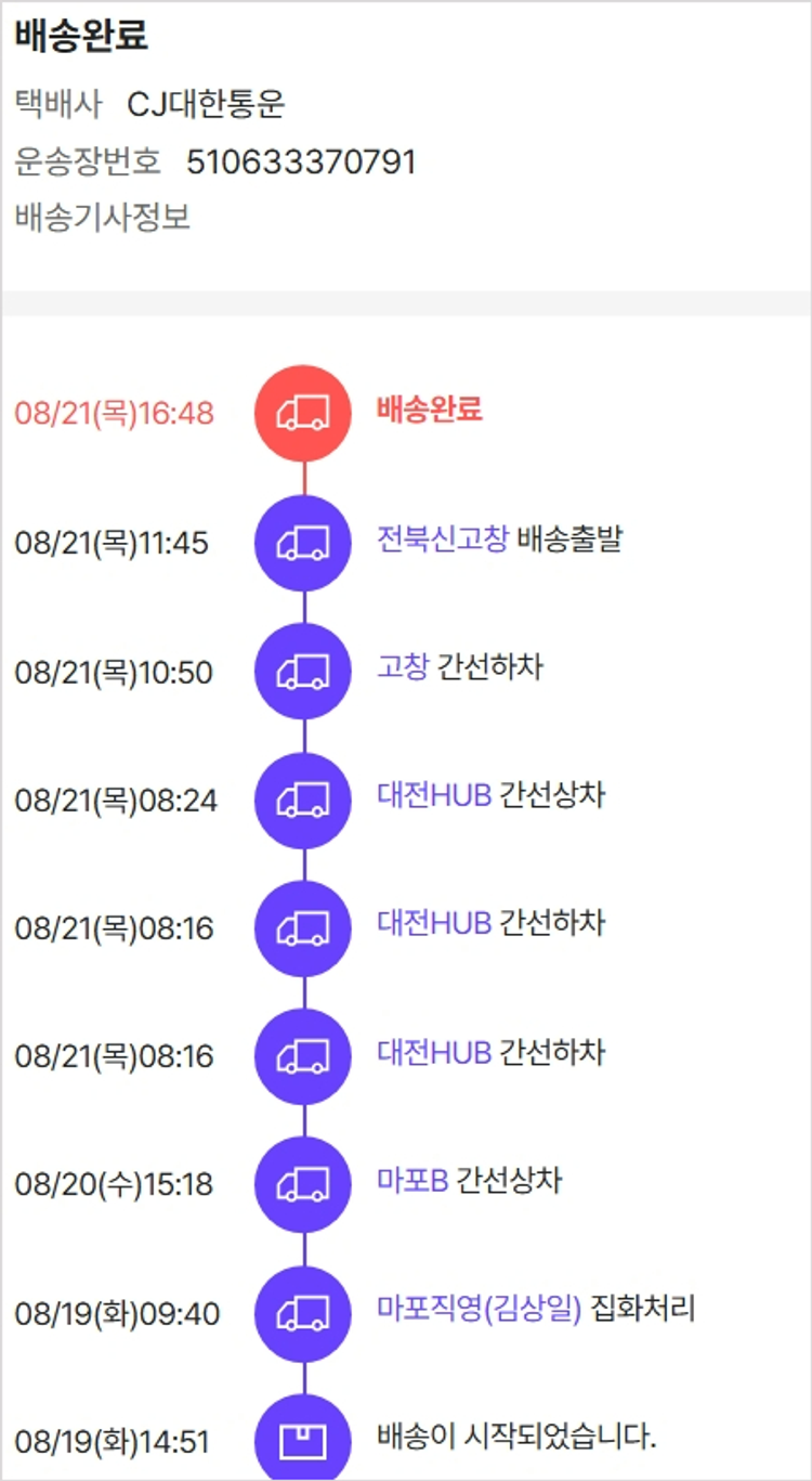 기부자님이 사용한 기부포인트 7,000원, 물품배송비 3,000원, 가격상승분 3,860원, 100원 미만 지원금 70원, 결제 수수료 16,542원, 기타 사업비는 행복나눔재단이 부담했습니다. (기부후기 발송시점에 최종 업데이트 됩니다.) 상품 주문 건 중 품절 발생하여 2025-08-18 재주문하였습니다. 실제 쇼핑몰에서 확인되는 배송현황을 캡처한 내용입니다. 실시간 자료와는 차이가 있을 수 있습니다.