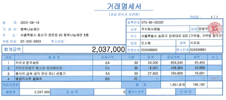 - 기타 발생하는 모든 비용은 행복나눔재단이 부담해요. (배송비, 수수료 등)