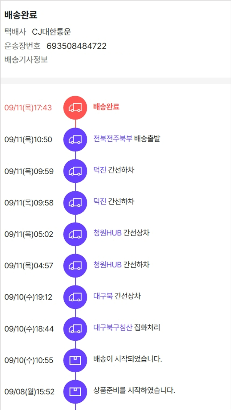 기부자님이 사용한 기부포인트 4,000원, 가격상승분 2,136원, 100원 미만 지원금 61원, 결제 수수료 17,157원, 기타 사업비는 행복나눔재단이 부담했습니다. (기부후기 발송시점에 최종 업데이트 됩니다.) 상품 주문 건 중 품절 발생하여 2025-09-08 재주문하였습니다. 실제 쇼핑몰에서 확인되는 배송현황을 캡처한 내용입니다. 실시간 자료와는 차이가 있을 수 있습니다.