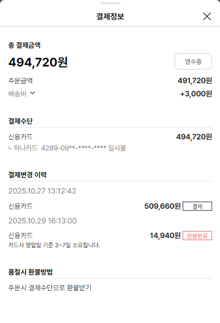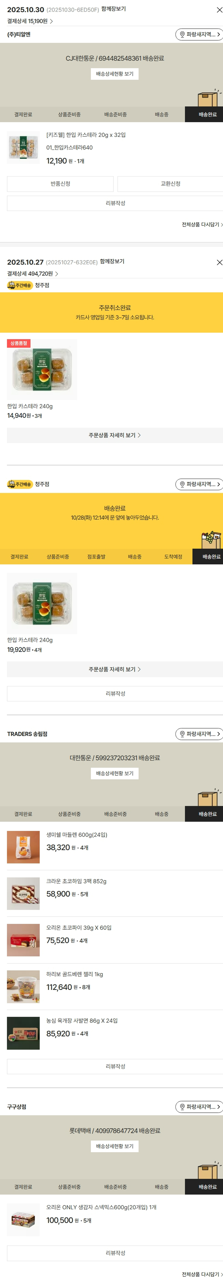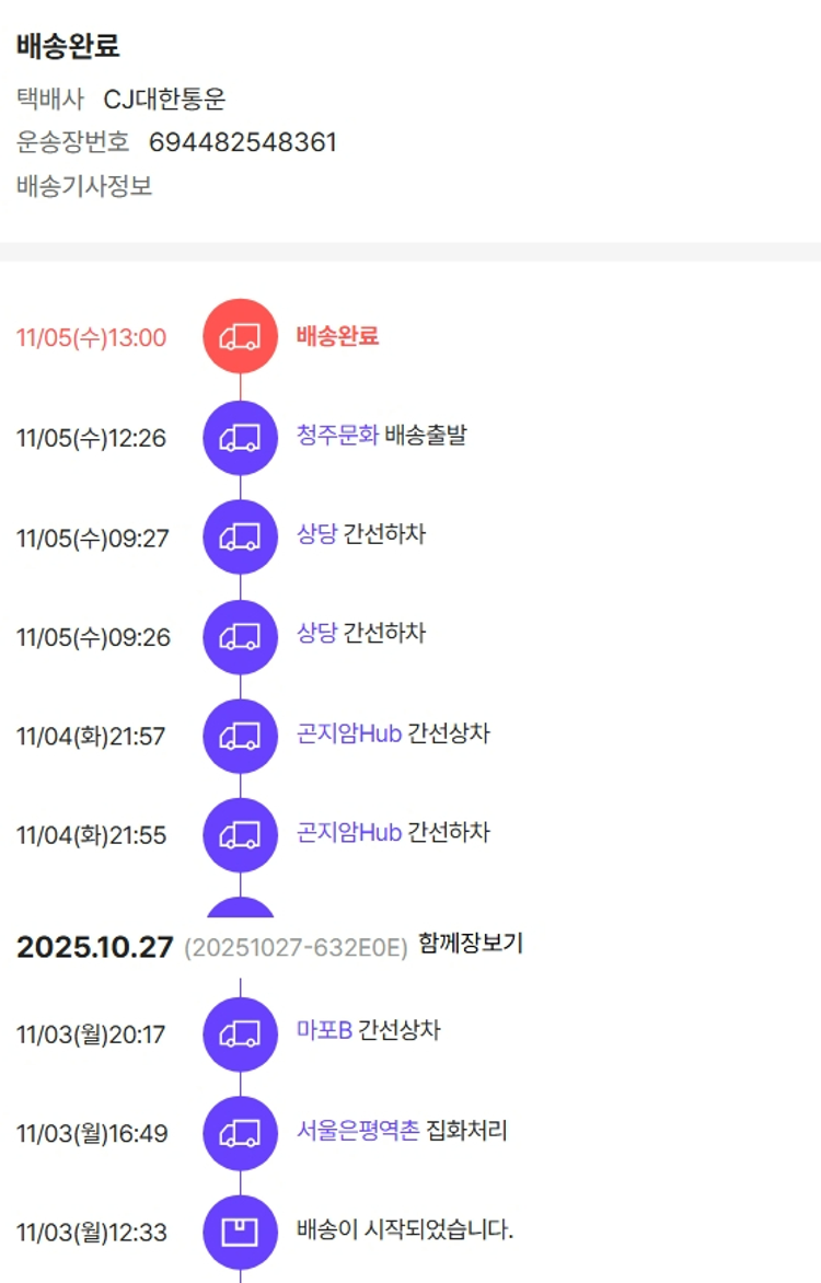 물품배송비 6,000원, 가격상승분 7,910원, 기타 사업비는 행복나눔재단이 부담했습니다. (기부후기 발송시점에 최종 업데이트 됩니다.) 상품 주문 건 중 품절 발생하여 2025-10-30 재주문하였습니다. 실제 쇼핑몰에서 확인되는 배송현황을 캡처한 내용입니다. 실시간 자료와는 차이가 있을 수 있습니다.