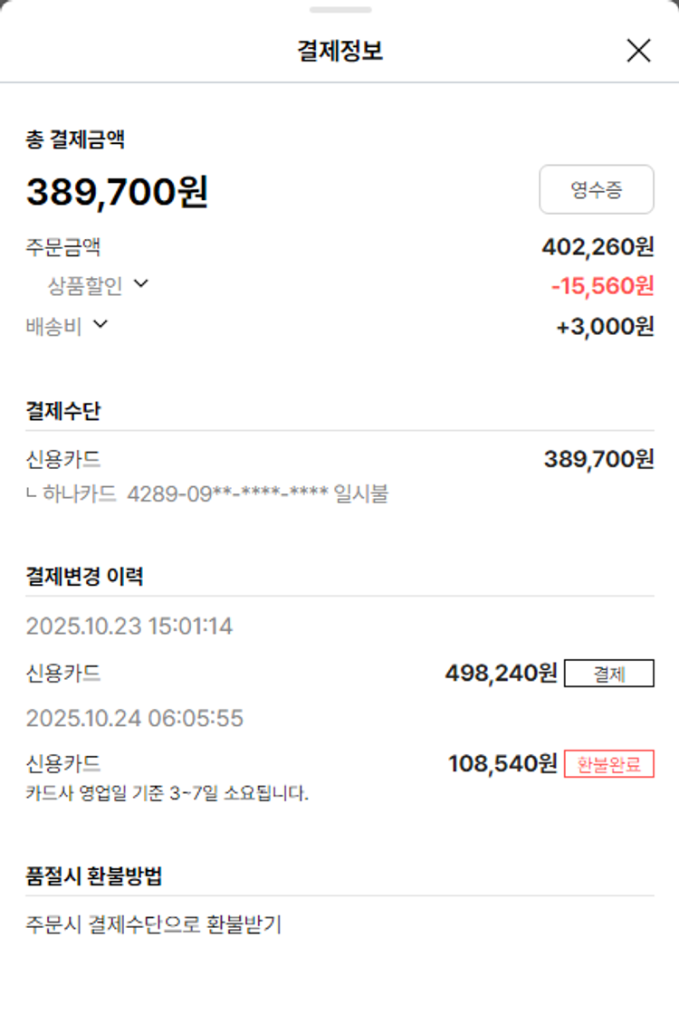 물품배송비 3,000원, 가격상승분 8,490원, 100원 미만 지원금 10원, 기타 사업비는 행복나눔재단이 부담했습니다. (기부후기 발송시점에 최종 업데이트 됩니다.) 상품 주문 건 중 품절 발생하여 2025-10-30 재주문하였습니다. 실제 쇼핑몰에서 확인되는 배송현황을 캡처한 내용입니다. 실시간 자료와는 차이가 있을 수 있습니다.