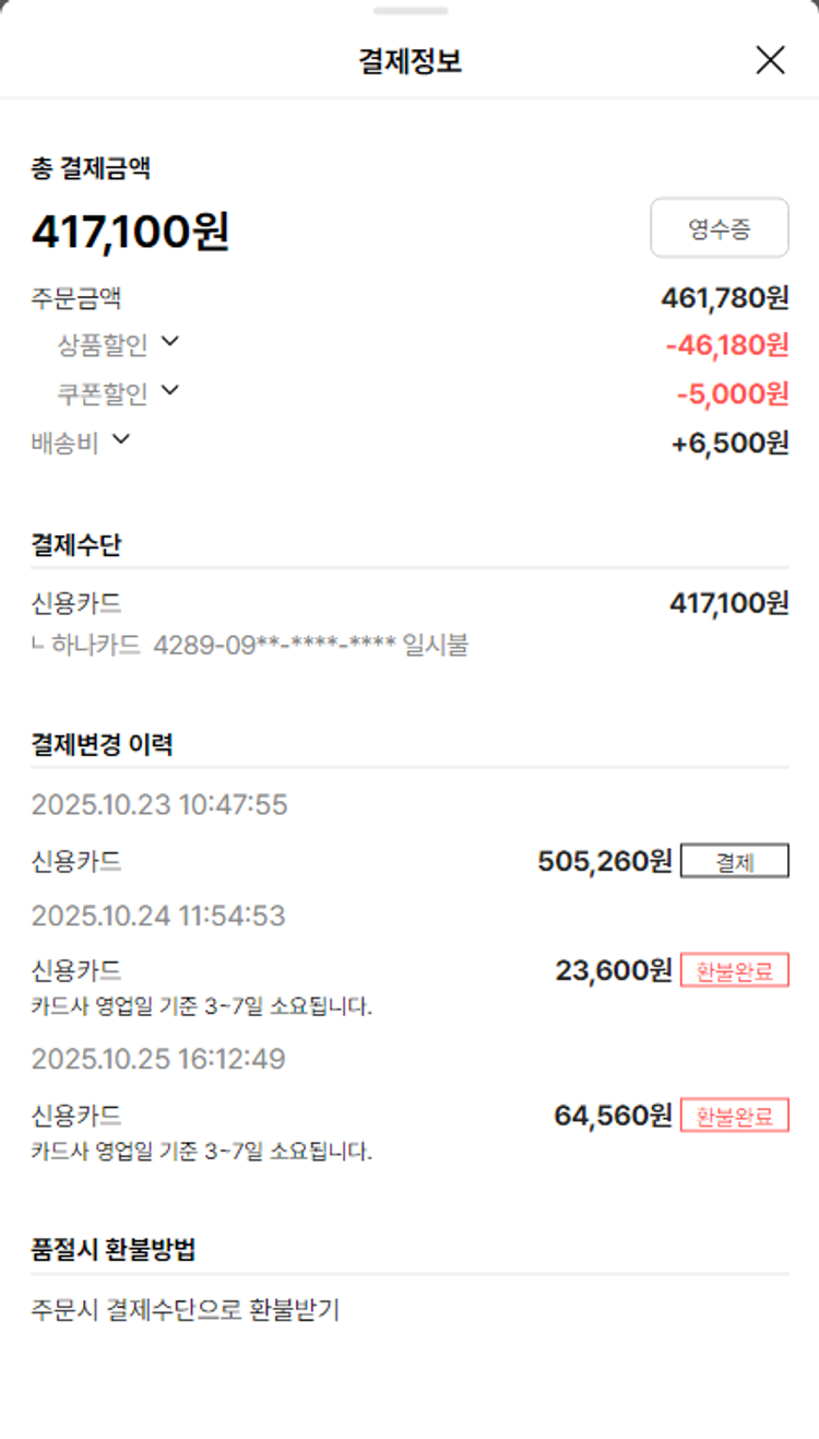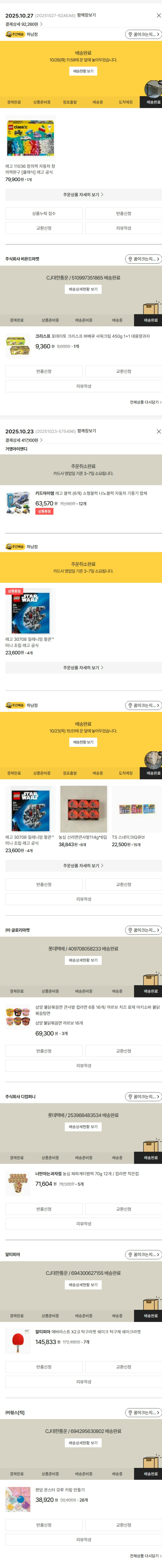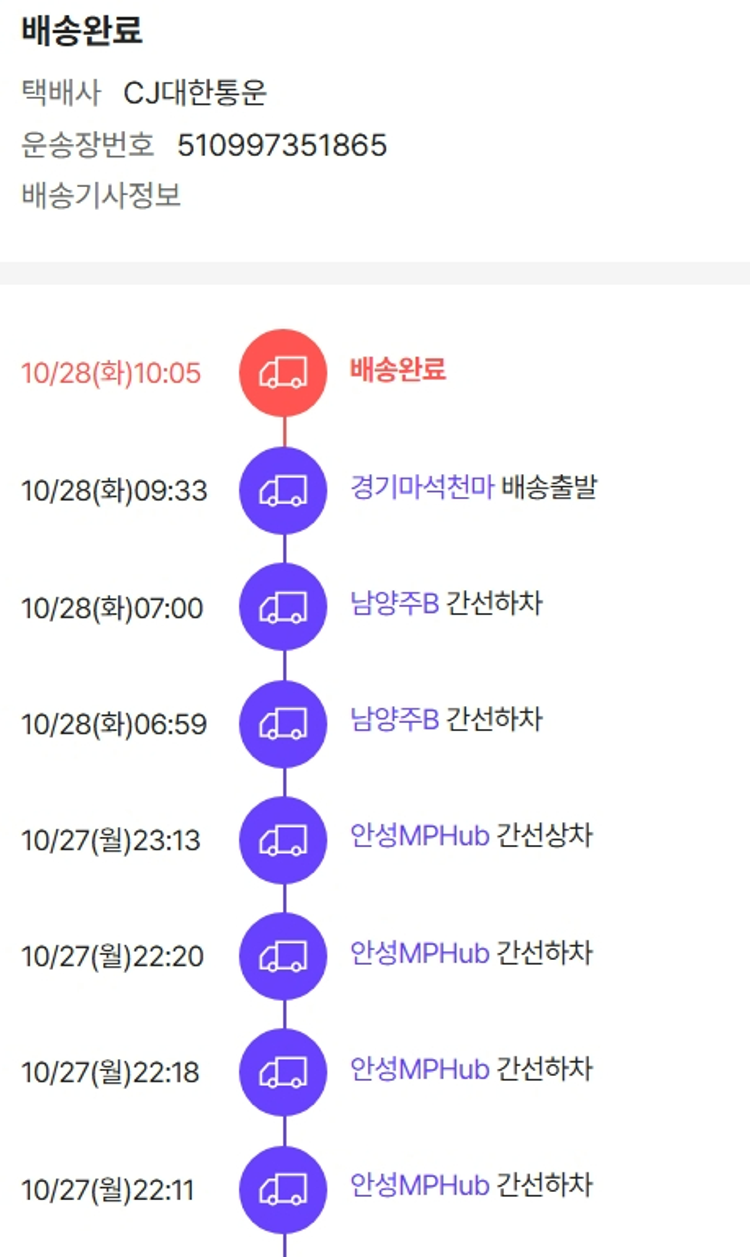 물품배송비 9,500원, 가격상승분 8,120원, 100원 미만 지원금 40원, 기타 사업비는 행복나눔재단이 부담했습니다. (기부후기 발송시점에 최종 업데이트 됩니다.) 상품 주문 건 중 품절 발생하여 2025-10-27 재주문하였습니다. 실제 쇼핑몰에서 확인되는 배송현황을 캡처한 내용입니다. 실시간 자료와는 차이가 있을 수 있습니다.