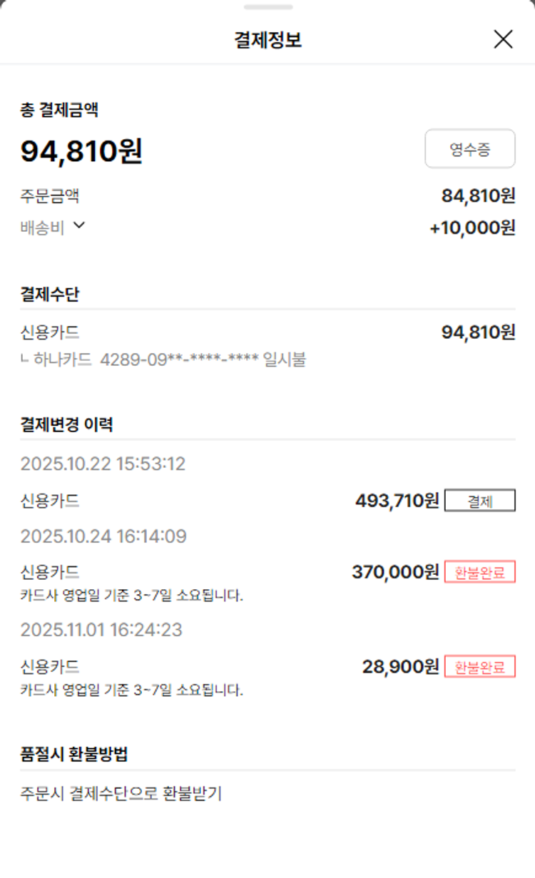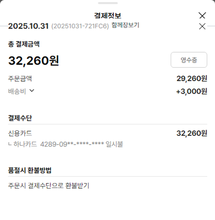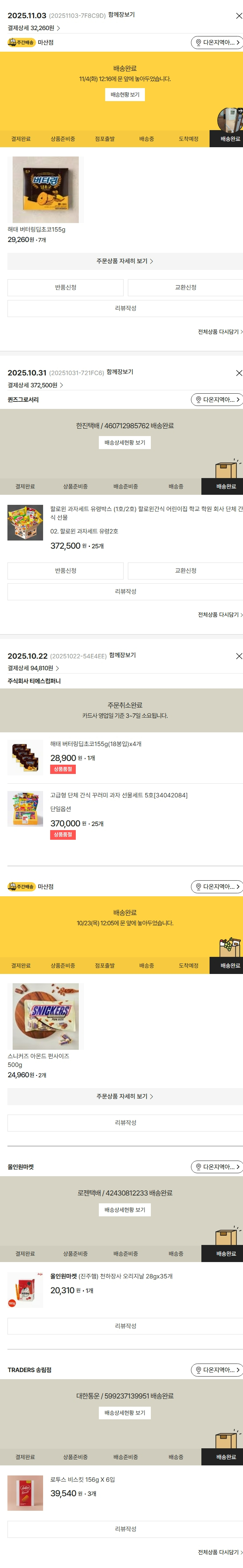 물품배송비 13,000원, 가격상승분 2,860원, 100원 미만 지원금 10원, 기타 사업비는 행복나눔재단이 부담했습니다. (기부후기 발송시점에 최종 업데이트 됩니다.) 상품 주문 건 중 품절 발생하여 2025-11-03 재주문하였습니다. 실제 쇼핑몰에서 확인되는 배송현황을 캡처한 내용입니다. 실시간 자료와는 차이가 있을 수 있습니다.
