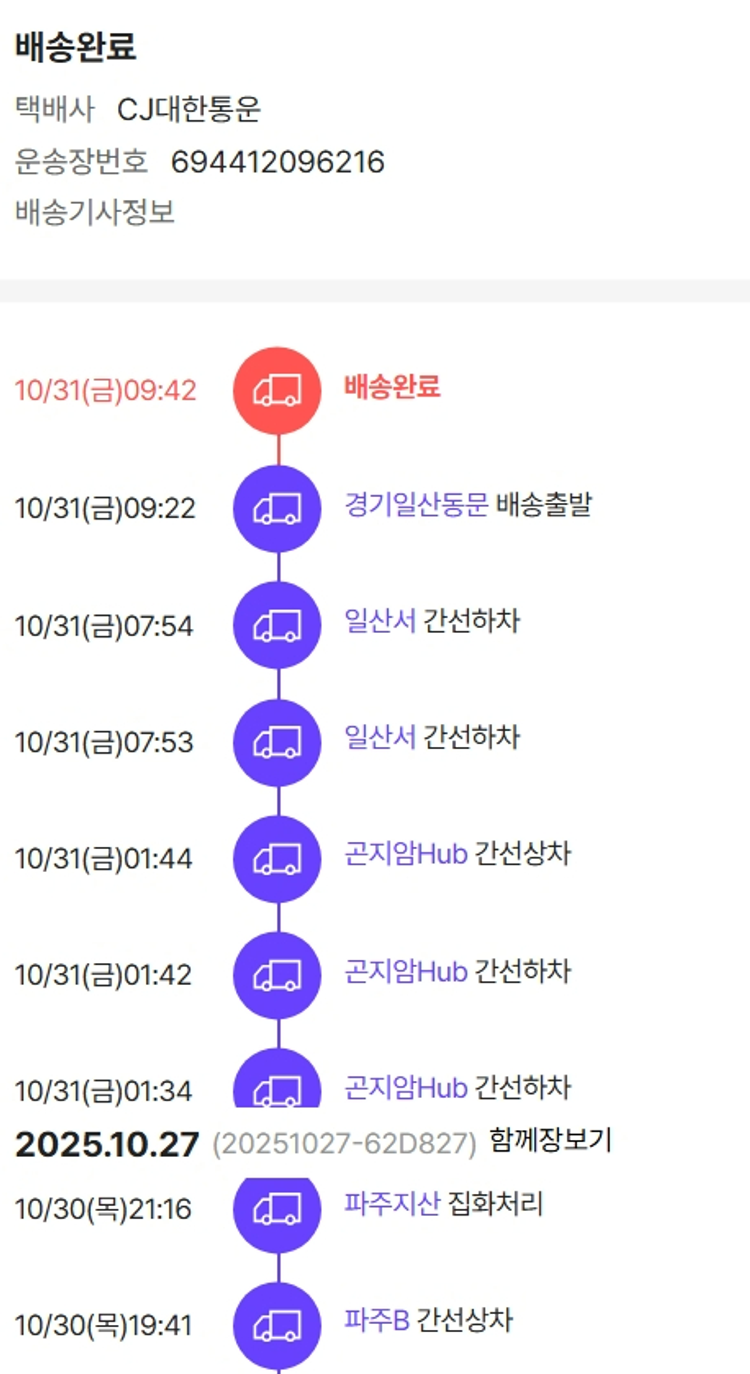 기부자님이 사용한 기부포인트 3,600원, 물품배송비 3,000원, 가격상승분 12,120원, 100원 미만 지원금 45원, 결제 수수료 11,695원, 기타 사업비는 행복나눔재단이 부담했습니다. (기부후기 발송시점에 최종 업데이트 됩니다.) 상품 주문 건 중 품절 발생하여 2025-10-29 재주문하였습니다. 실제 쇼핑몰에서 확인되는 배송현황을 캡처한 내용입니다. 실시간 자료와는 차이가 있을 수 있습니다.