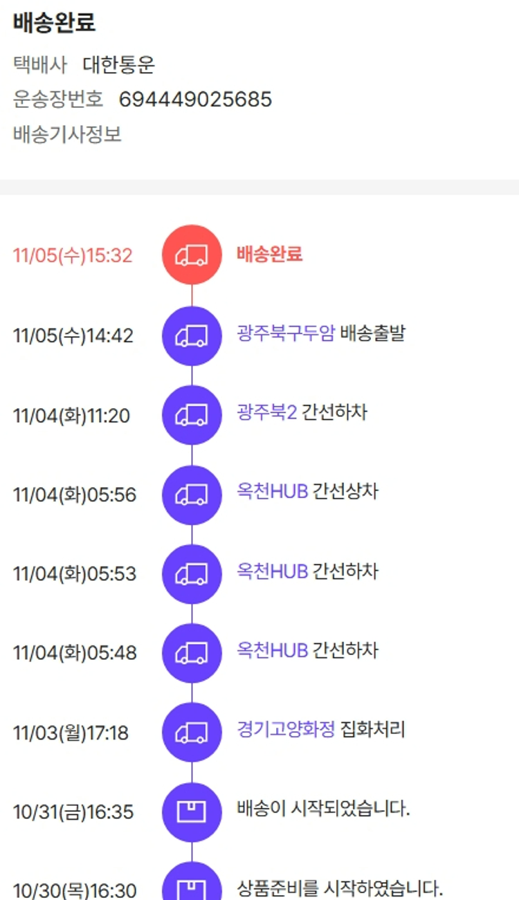 기부자님이 사용한 기부포인트 4,700원, 물품배송비 6,000원, 가격상승분 17,098원, 100원 미만 지원금 70원, 결제 수수료 10,585원, 기타 사업비는 행복나눔재단이 부담했습니다. (기부후기 발송시점에 최종 업데이트 됩니다.) 상품 주문 건 중 품절 발생하여 2025-10-30 재주문하였습니다. 실제 쇼핑몰에서 확인되는 배송현황을 캡처한 내용입니다. 실시간 자료와는 차이가 있을 수 있습니다.