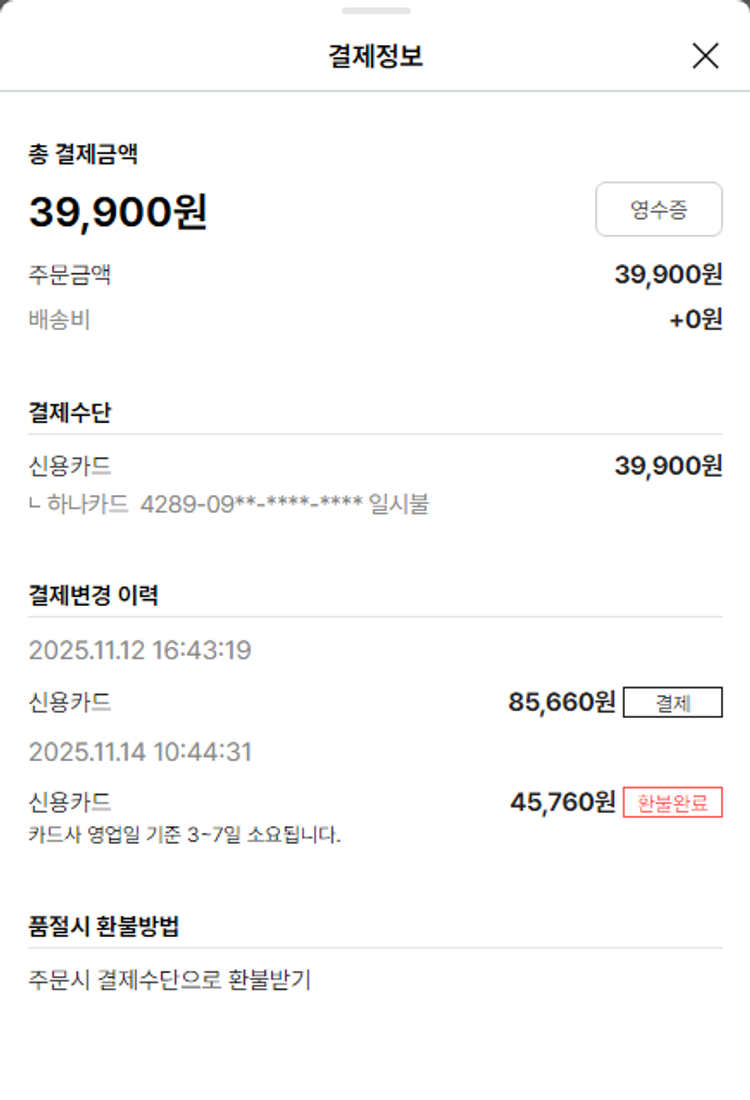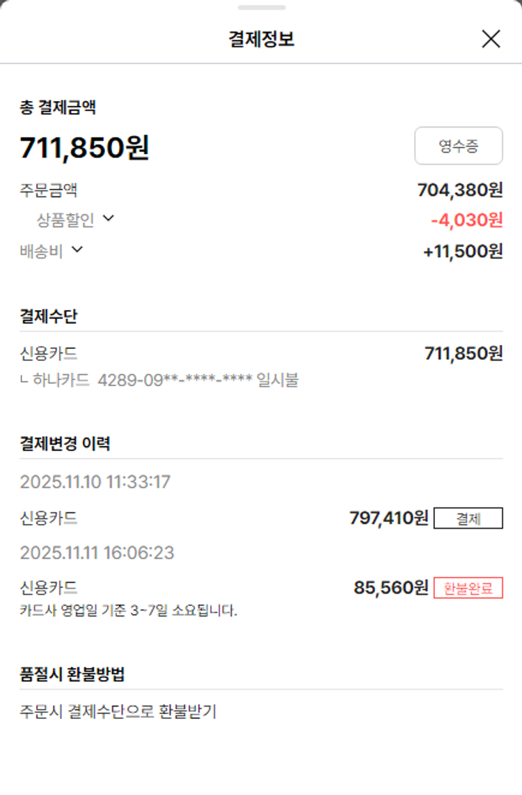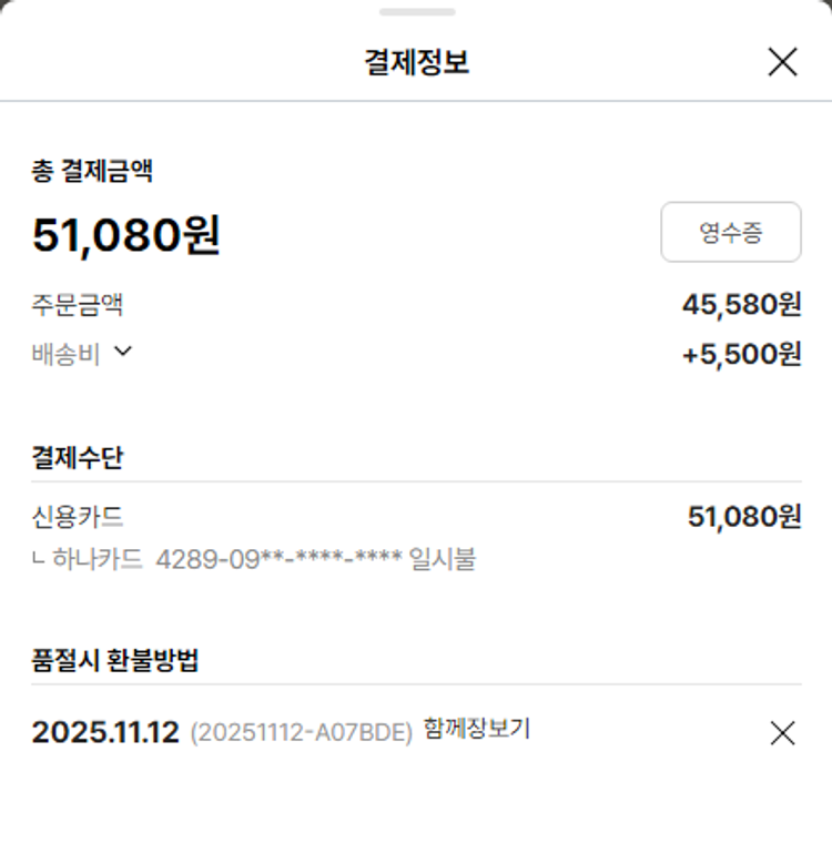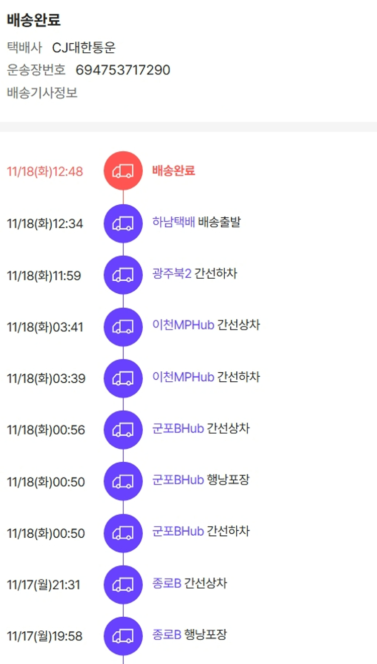 기부자님이 사용한 기부포인트 1,550원, 물품배송비 17,000원, 가격상승분 5,590원, 100원 미만 지원금 40원, 결제 수수료 21,087원, 기타 사업비는 행복나눔재단이 부담했습니다. (기부후기 발송시점에 최종 업데이트 됩니다.) 상품 주문 건 중 품절 발생하여 2025-11-17 재주문하였습니다. 실제 쇼핑몰에서 확인되는 배송현황을 캡처한 내용입니다. 실시간 자료와는 차이가 있을 수 있습니다.
