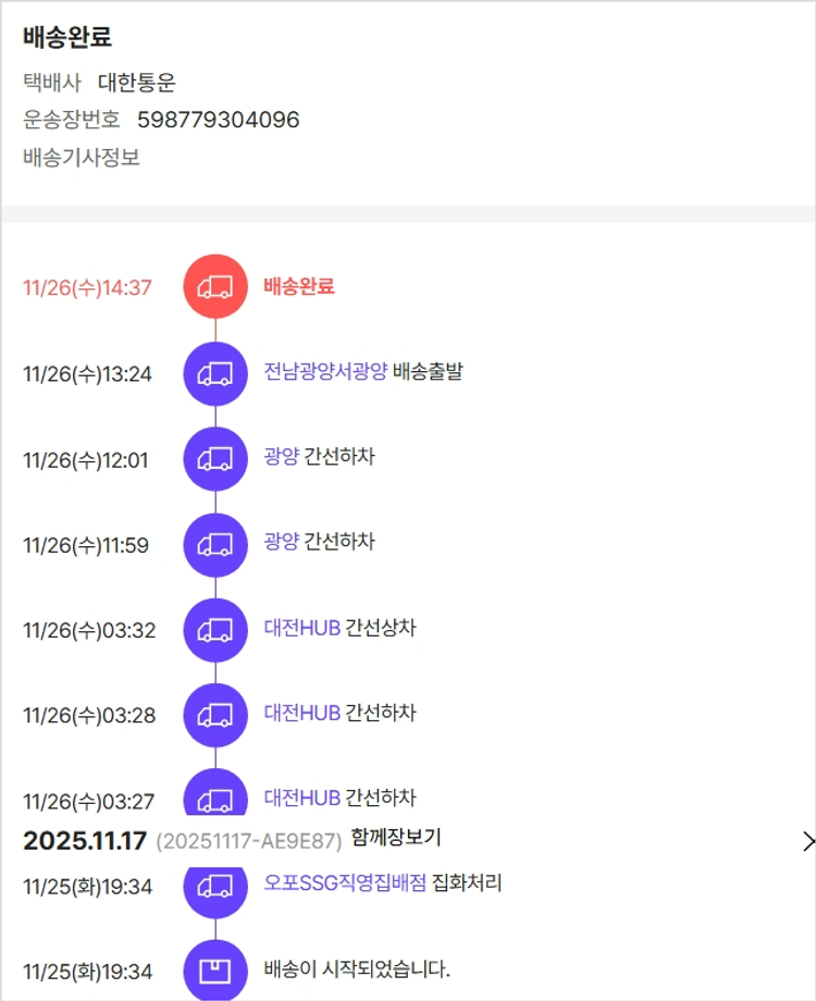 가격상승분 1,730원, 100원 미만 지원금 68원, 결제 수수료 15,667원, 기타 사업비는 행복나눔재단이 부담했습니다. (기부후기 발송시점에 최종 업데이트 됩니다.) 상품 주문 건 중 품절 발생하여 2025-11-24 재주문하였습니다. 실제 쇼핑몰에서 확인되는 배송현황을 캡처한 내용입니다. 실시간 자료와는 차이가 있을 수 있습니다.