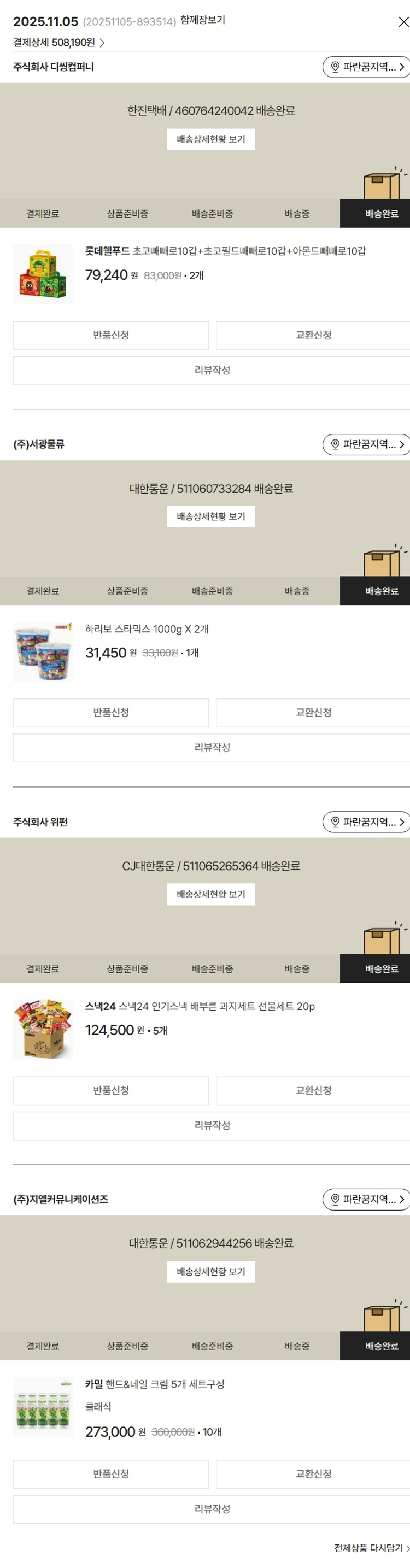 기부자님이 사용한 기부포인트 5,550원, 가격상승분 12,090원, 결제 수수료 11,232원, 기타 사업비는 행복나눔재단이 부담했습니다. (기부후기 발송시점에 최종 업데이트 됩니다.) 실제 쇼핑몰에서 확인되는 배송현황을 캡처한 내용입니다. 실시간 자료와는 차이가 있을 수 있습니다.