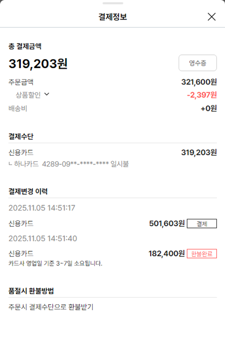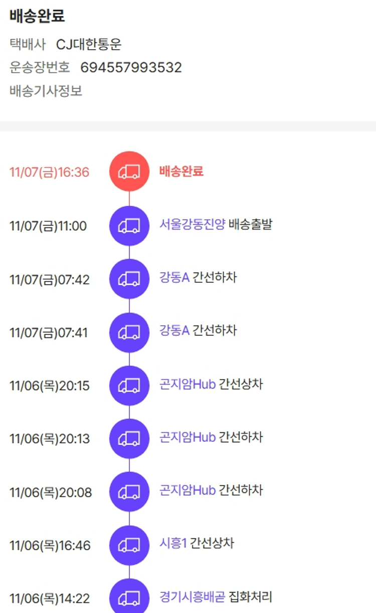 물품배송비 6,500원, 가격상승분 3,902원, 100원 미만 지원금 6원, 결제 수수료 11,161원, 기타 사업비는 행복나눔재단이 부담했습니다. (기부후기 발송시점에 최종 업데이트 됩니다.) 상품 주문 건 중 품절 발생하여 2025-11-05 재주문하였습니다. 실제 쇼핑몰에서 확인되는 배송현황을 캡처한 내용입니다. 실시간 자료와는 차이가 있을 수 있습니다.