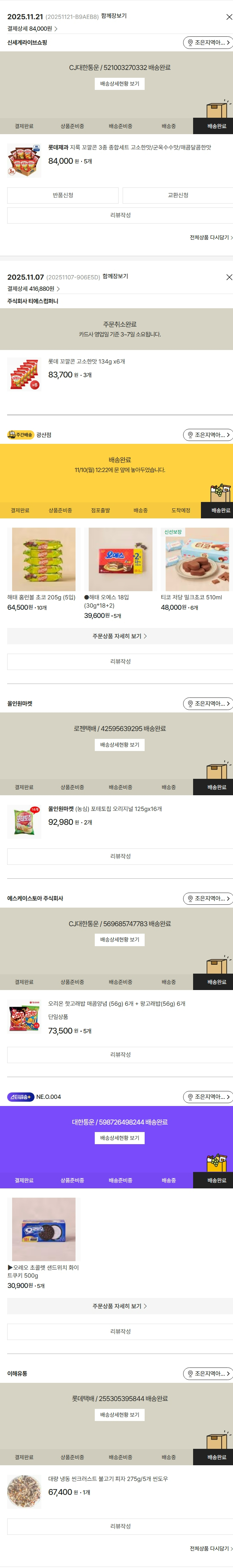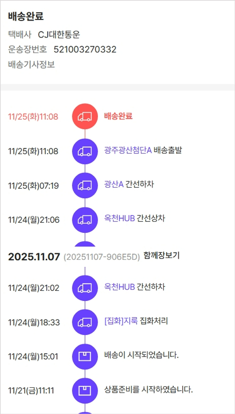 기부자님이 사용한 기부포인트 3,750원, 가격상승분 8,300원, 100원 미만 지원금 80원, 결제 수수료 10,749원, 기타 사업비는 행복나눔재단이 부담했습니다. (기부후기 발송시점에 최종 업데이트 됩니다.) 상품 주문 건 중 품절 발생하여 2025-11-21 재주문하였습니다. 실제 쇼핑몰에서 확인되는 배송현황을 캡처한 내용입니다. 실시간 자료와는 차이가 있을 수 있습니다.