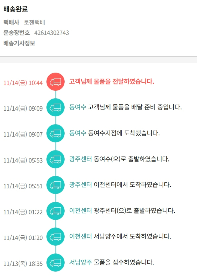 기부자님이 사용한 기부포인트 2,500원, 물품배송비 7,500원, 가격상승분 420원, 100원 미만 지원금 50원, 결제 수수료 11,078원, 기타 사업비는 행복나눔재단이 부담했습니다. (기부후기 발송시점에 최종 업데이트 됩니다.) 실제 쇼핑몰에서 확인되는 배송현황을 캡처한 내용입니다. 실시간 자료와는 차이가 있을 수 있습니다.