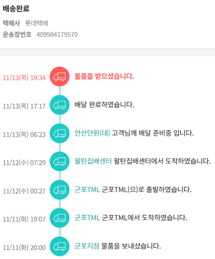 기부자님이 사용한 기부포인트 4,100원, 물품배송비 6,000원, 가격상승분 4,130원, 100원 미만 지원금 30원, 결제 수수료 11,373원, 기타 사업비는 행복나눔재단이 부담했습니다. (기부후기 발송시점에 최종 업데이트 됩니다.) 실제 쇼핑몰에서 확인되는 배송현황을 캡처한 내용입니다. 실시간 자료와는 차이가 있을 수 있습니다.