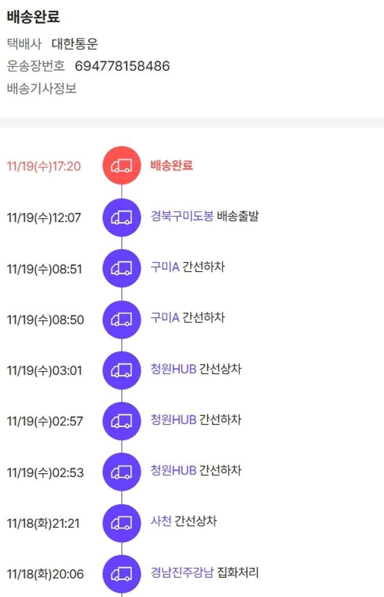 가격상승분 7,460원, 100원 미만 지원금 40원, 결제 수수료 10,961원, 기타 사업비는 행복나눔재단이 부담했습니다. (기부후기 발송시점에 최종 업데이트 됩니다.) 실제 쇼핑몰에서 확인되는 배송현황을 캡처한 내용입니다. 실시간 자료와는 차이가 있을 수 있습니다.