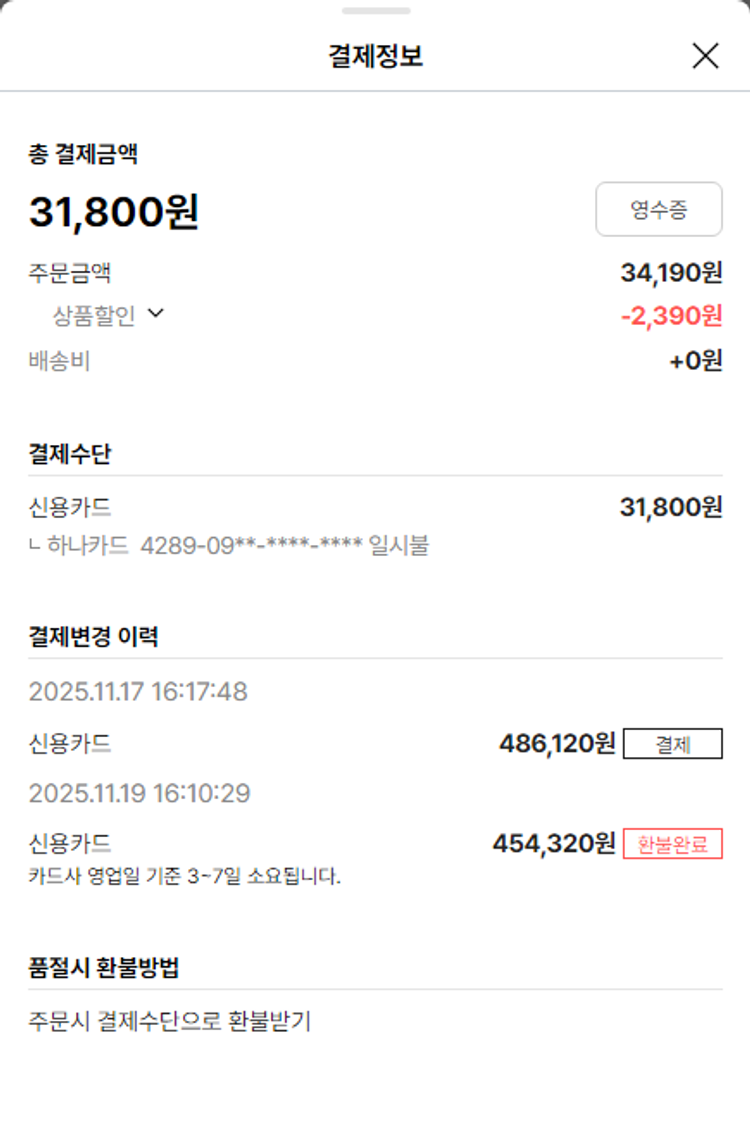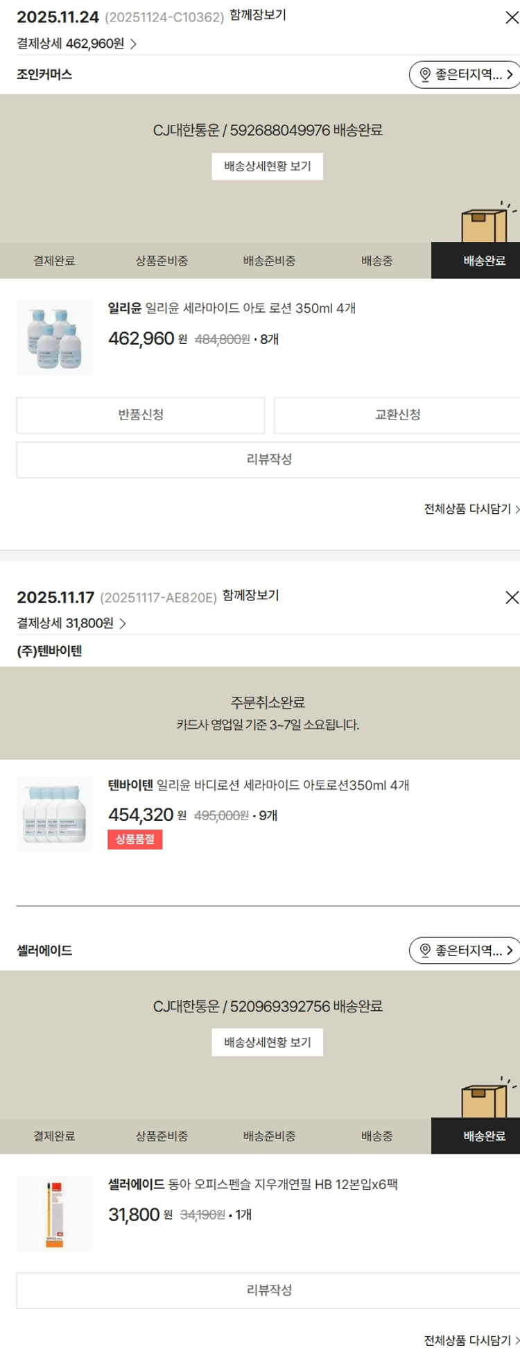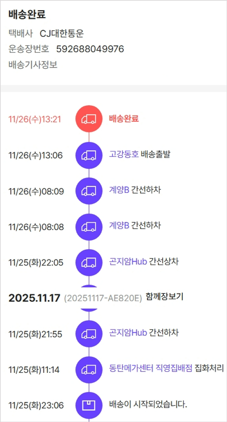 가격상승분 8,640원, 100원 미만 지원금 20원, 결제 수수료 10,639원, 기타 사업비는 행복나눔재단이 부담했습니다. (기부후기 발송시점에 최종 업데이트 됩니다.) 상품 주문 건 중 품절 발생하여 2025-11-24 재주문하였습니다. 실제 쇼핑몰에서 확인되는 배송현황을 캡처한 내용입니다. 실시간 자료와는 차이가 있을 수 있습니다.