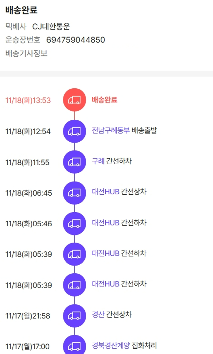기부자님이 사용한 기부포인트 13,200원, 결제 수수료 11,136원, 기타 사업비는 행복나눔재단이 부담했습니다. (기부후기 발송시점에 최종 업데이트 됩니다.) 실제 쇼핑몰에서 확인되는 배송현황을 캡처한 내용입니다. 실시간 자료와는 차이가 있을 수 있습니다.