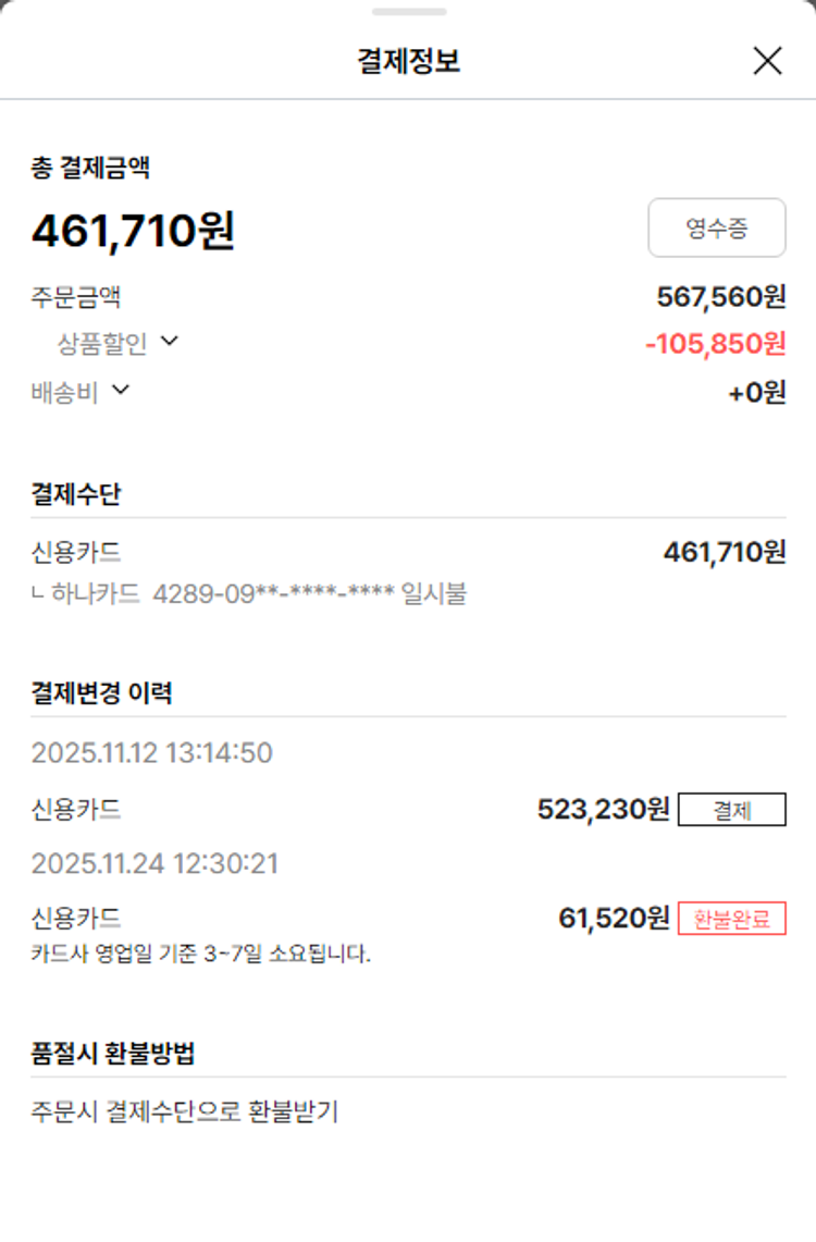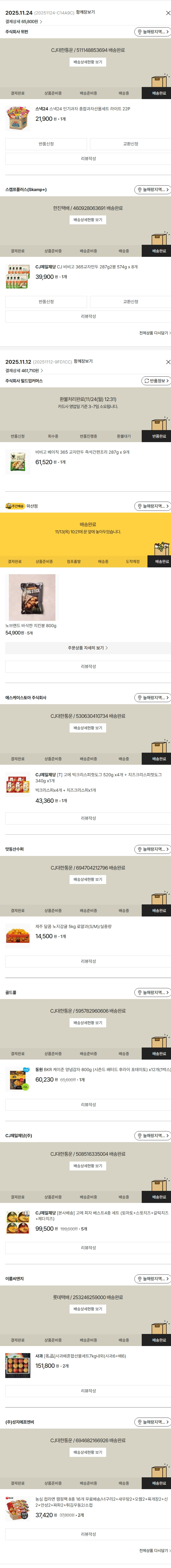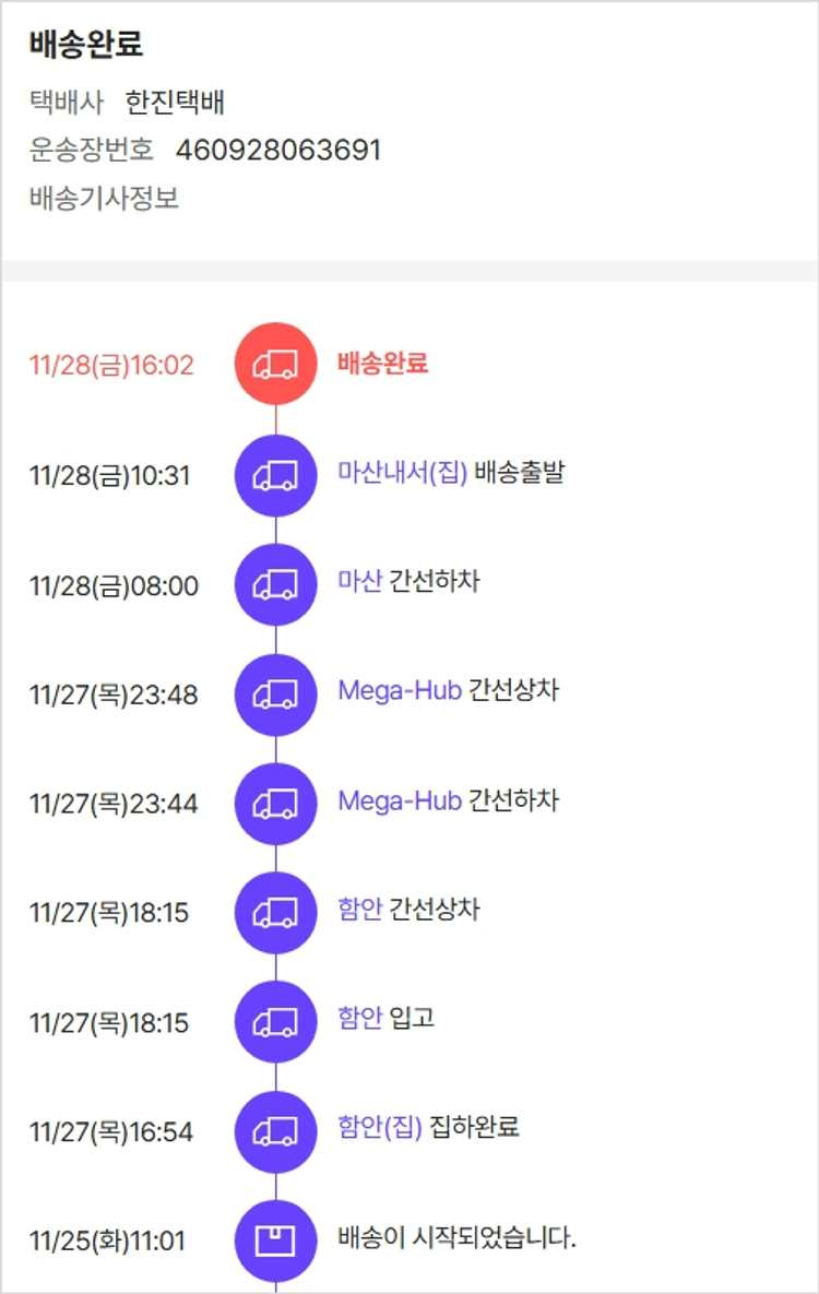 기부자님이 사용한 기부포인트 6,000원, 물품배송비 4,000원, 가격상승분 2,270원, 100원 미만 지원금 40원, 결제 수수료 11,414원, 기타 사업비는 행복나눔재단이 부담했습니다. (기부후기 발송시점에 최종 업데이트 됩니다.) 상품 주문 건 중 품절 발생하여 2025-11-24 재주문하였습니다. 실제 쇼핑몰에서 확인되는 배송현황을 캡처한 내용입니다. 실시간 자료와는 차이가 있을 수 있습니다.