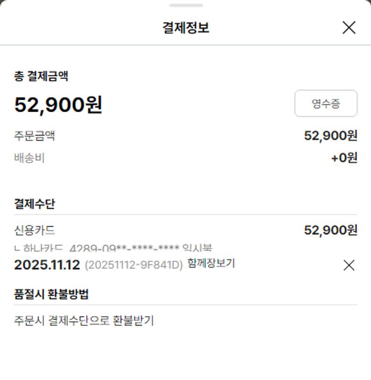 가격상승분 3,900원, 결제 수수료 11,903원, 기타 사업비는 행복나눔재단이 부담했습니다. (기부후기 발송시점에 최종 업데이트 됩니다.) 상품 주문 건 중 품절 발생하여 2025-11-24 재주문하였습니다. 실제 쇼핑몰에서 확인되는 배송현황을 캡처한 내용입니다. 실시간 자료와는 차이가 있을 수 있습니다.