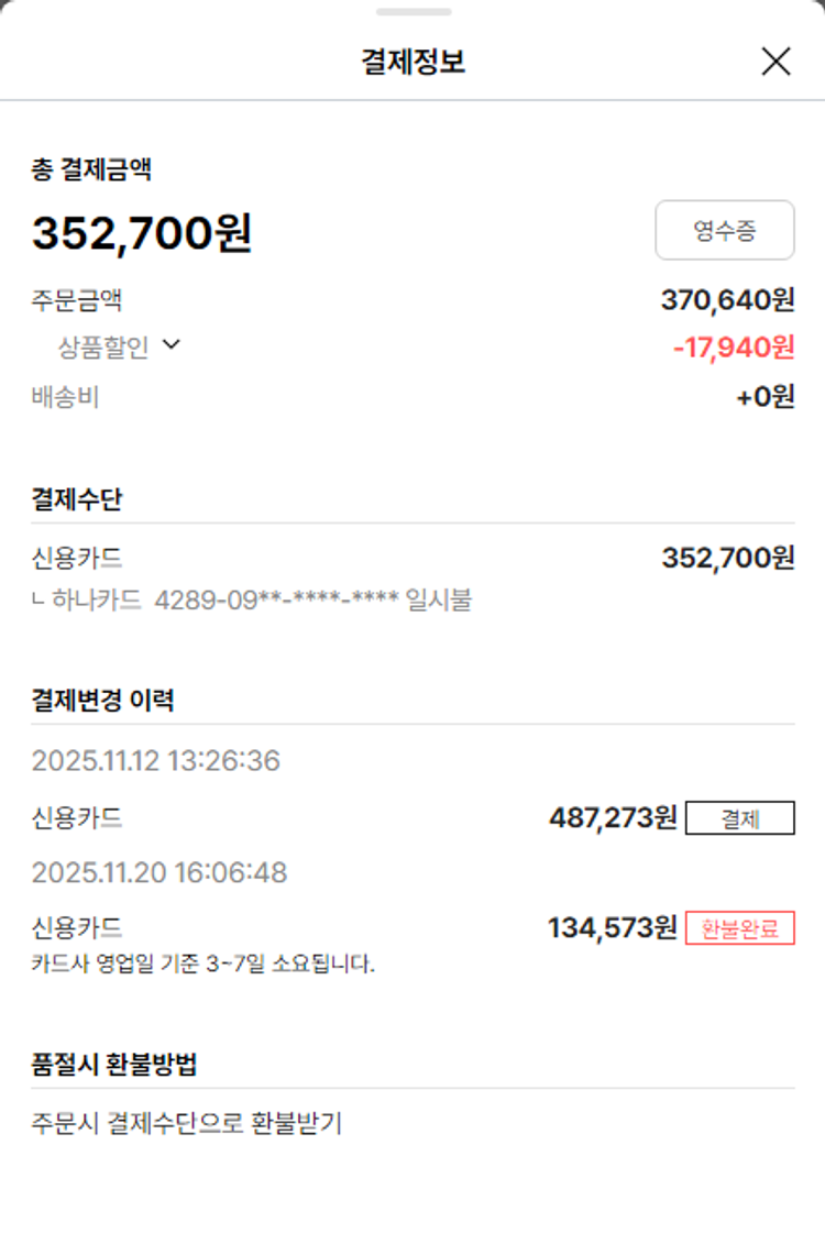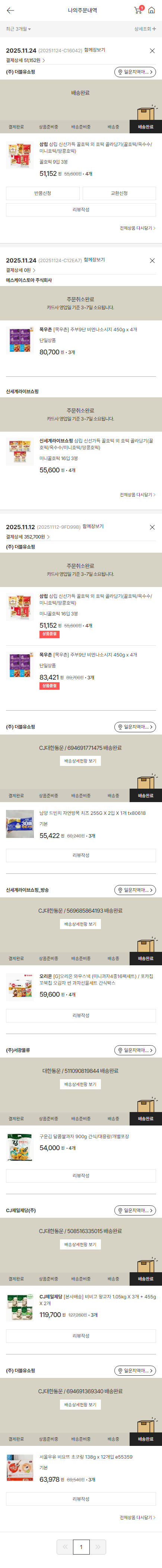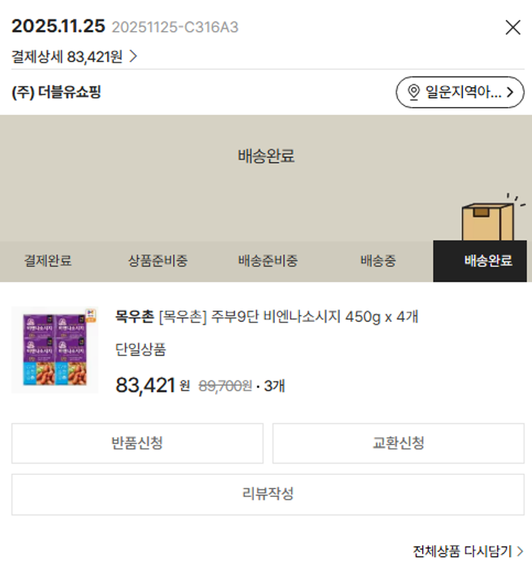 가격상승분 9,763원, 100원 미만 지원금 10원, 결제 수수료 11,530원, 기타 사업비는 행복나눔재단이 부담했습니다. (기부후기 발송시점에 최종 업데이트 됩니다.) 상품 주문 건 중 품절 발생하여 2025-11-25 재주문하였습니다. 실제 쇼핑몰에서 확인되는 배송현황을 캡처한 내용입니다. 실시간 자료와는 차이가 있을 수 있습니다.