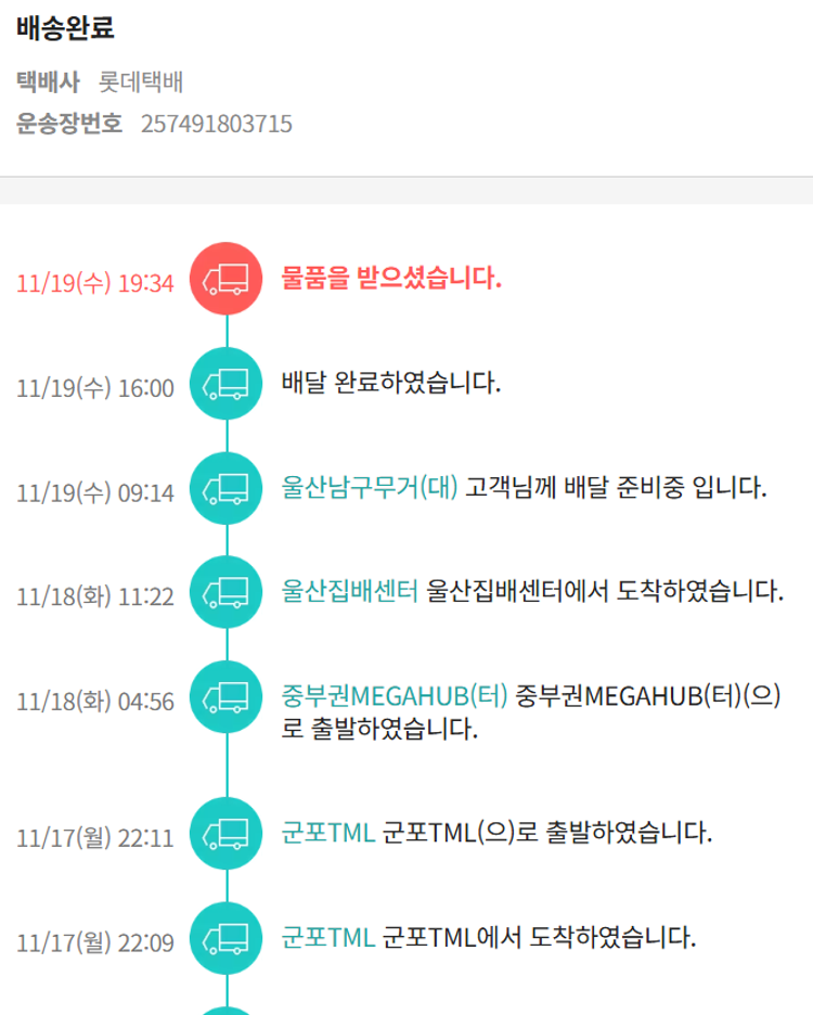 기부자님이 사용한 기부포인트 3,800원, 100원 미만 지원금 50원, 결제 수수료 11,034원, 기타 사업비는 행복나눔재단이 부담했습니다. (기부후기 발송시점에 최종 업데이트 됩니다.) 실제 쇼핑몰에서 확인되는 배송현황을 캡처한 내용입니다. 실시간 자료와는 차이가 있을 수 있습니다.