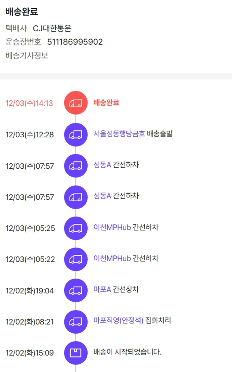 기부자님이 사용한 기부포인트 22,400원, 물품배송비 6,500원, 가격상승분 5,500원, 결제 수수료 10,625원, 기타 사업비는 행복나눔재단이 부담했습니다. (기부후기 발송시점에 최종 업데이트 됩니다.) 상품 주문 건 중 품절 발생하여 2025-12-01 재주문하였습니다. 실제 쇼핑몰에서 확인되는 배송현황을 캡처한 내용입니다. 실시간 자료와는 차이가 있을 수 있습니다.