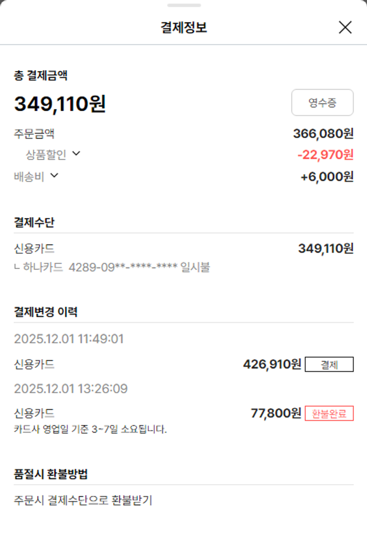 기부자님이 사용한 기부포인트 9,100원, 물품배송비 6,000원, 가격상승분 4,880원, 100원 미만 지원금 30원, 결제 수수료 8,775원, 기타 사업비는 행복나눔재단이 부담했습니다. (기부후기 발송시점에 최종 업데이트 됩니다.) 상품 주문 건 중 품절 발생하여 2025-12-01 재주문하였습니다. 실제 쇼핑몰에서 확인되는 배송현황을 캡처한 내용입니다. 실시간 자료와는 차이가 있을 수 있습니다.