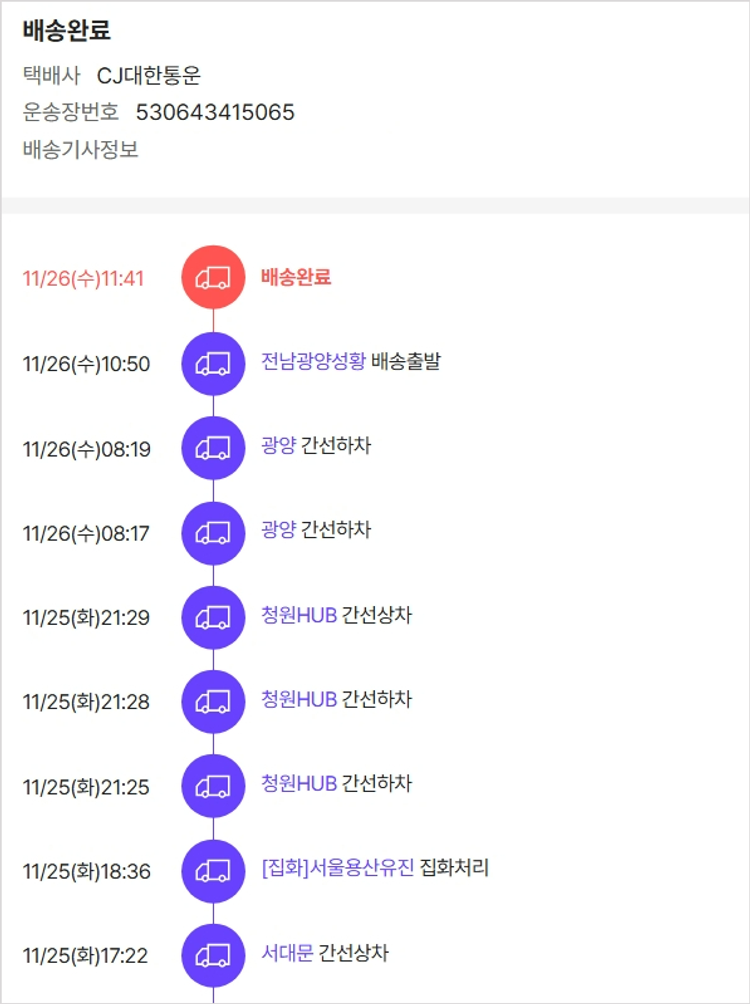 기부자님이 사용한 기부포인트 74,000원, 물품배송비 3,000원, 가격상승분 1,325원, 100원 미만 지원금 25원, 결제 수수료 5,407원, 기타 사업비는 행복나눔재단이 부담했습니다. (기부후기 발송시점에 최종 업데이트 됩니다.) 상품 주문 건 중 품절 발생하여 2025-11-24 재주문하였습니다. 실제 쇼핑몰에서 확인되는 배송현황을 캡처한 내용입니다. 실시간 자료와는 차이가 있을 수 있습니다.