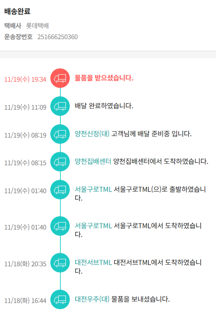 기부자님이 사용한 기부포인트 1,100원, 가격상승분 640원, 100원 미만 지원금 40원, 결제 수수료 10,586원, 기타 사업비는 행복나눔재단이 부담했습니다. (기부후기 발송시점에 최종 업데이트 됩니다.) 실제 쇼핑몰에서 확인되는 배송현황을 캡처한 내용입니다. 실시간 자료와는 차이가 있을 수 있습니다.