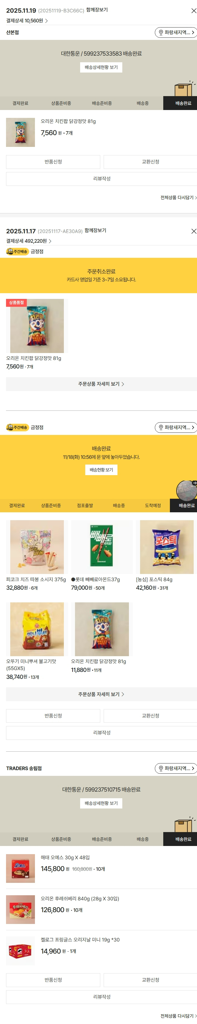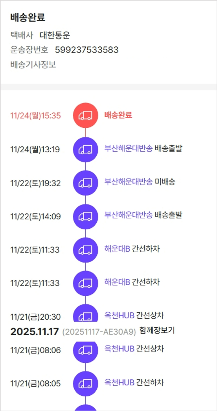 물품배송비 3,000원, 100원 미만 지원금 80원, 결제 수수료 11,130원, 기타 사업비는 행복나눔재단이 부담했습니다. (기부후기 발송시점에 최종 업데이트 됩니다.) 상품 주문 건 중 품절 발생하여 2025-11-19 재주문하였습니다. 실제 쇼핑몰에서 확인되는 배송현황을 캡처한 내용입니다. 실시간 자료와는 차이가 있을 수 있습니다.
