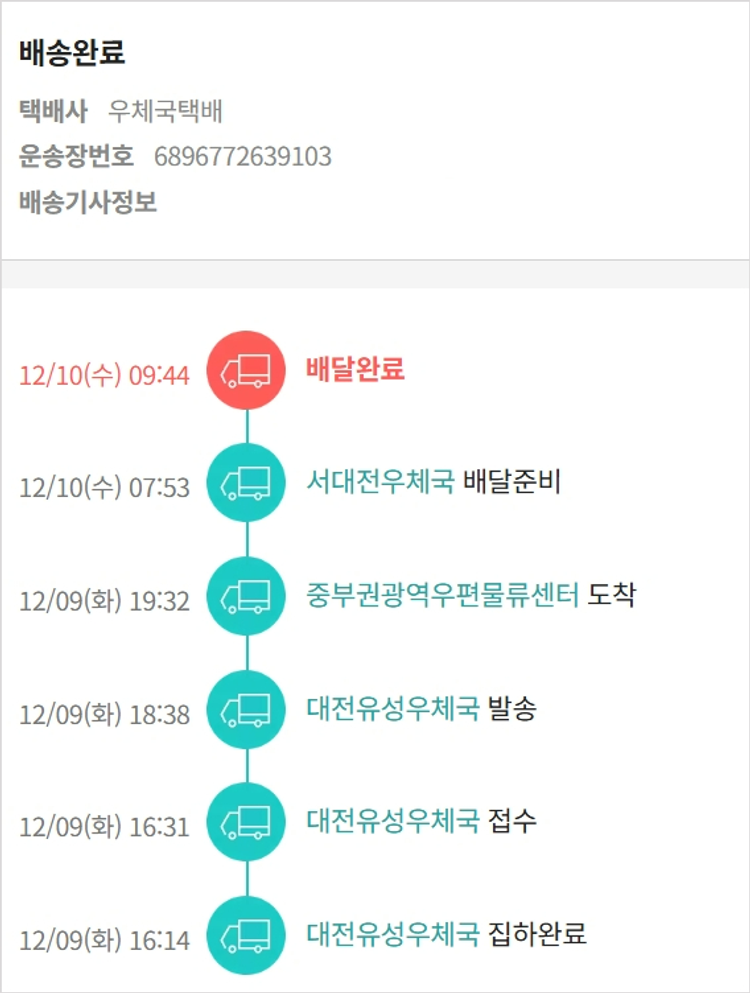 기부자님이 사용한 기부포인트 5,100원, 물품배송비 3,000원, 가격상승분 7,890원, 100원 미만 지원금 70원, 결제 수수료 11,112원, 기타 사업비는 행복나눔재단이 부담했습니다. (기부후기 발송시점에 최종 업데이트 됩니다.) 상품 주문 건 중 품절 발생하여 2025-12-08 재주문하였습니다. 실제 쇼핑몰에서 확인되는 배송현황을 캡처한 내용입니다. 실시간 자료와는 차이가 있을 수 있습니다.