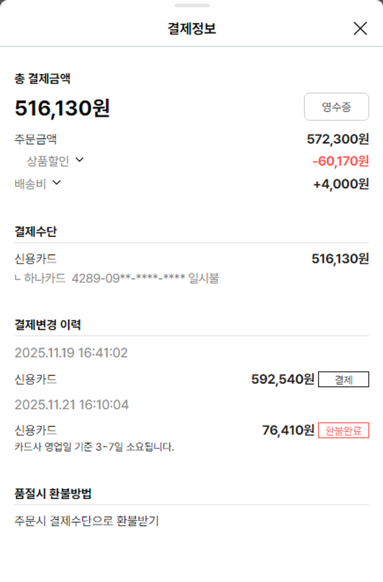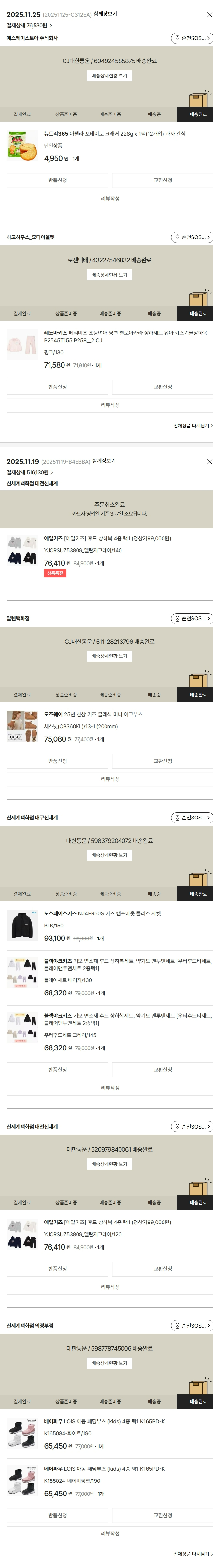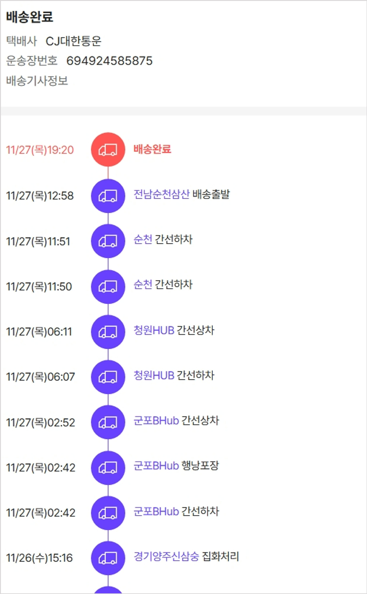 기부자님이 사용한 기부포인트 105,500원, 물품배송비 4,000원, 가격상승분 3,860원, 결제 수수료 10,872원, 기타 사업비는 행복나눔재단이 부담했습니다. (기부후기 발송시점에 최종 업데이트 됩니다.) 상품 주문 건 중 품절 발생하여 2025-11-25 재주문하였습니다. 실제 쇼핑몰에서 확인되는 배송현황을 캡처한 내용입니다. 실시간 자료와는 차이가 있을 수 있습니다.