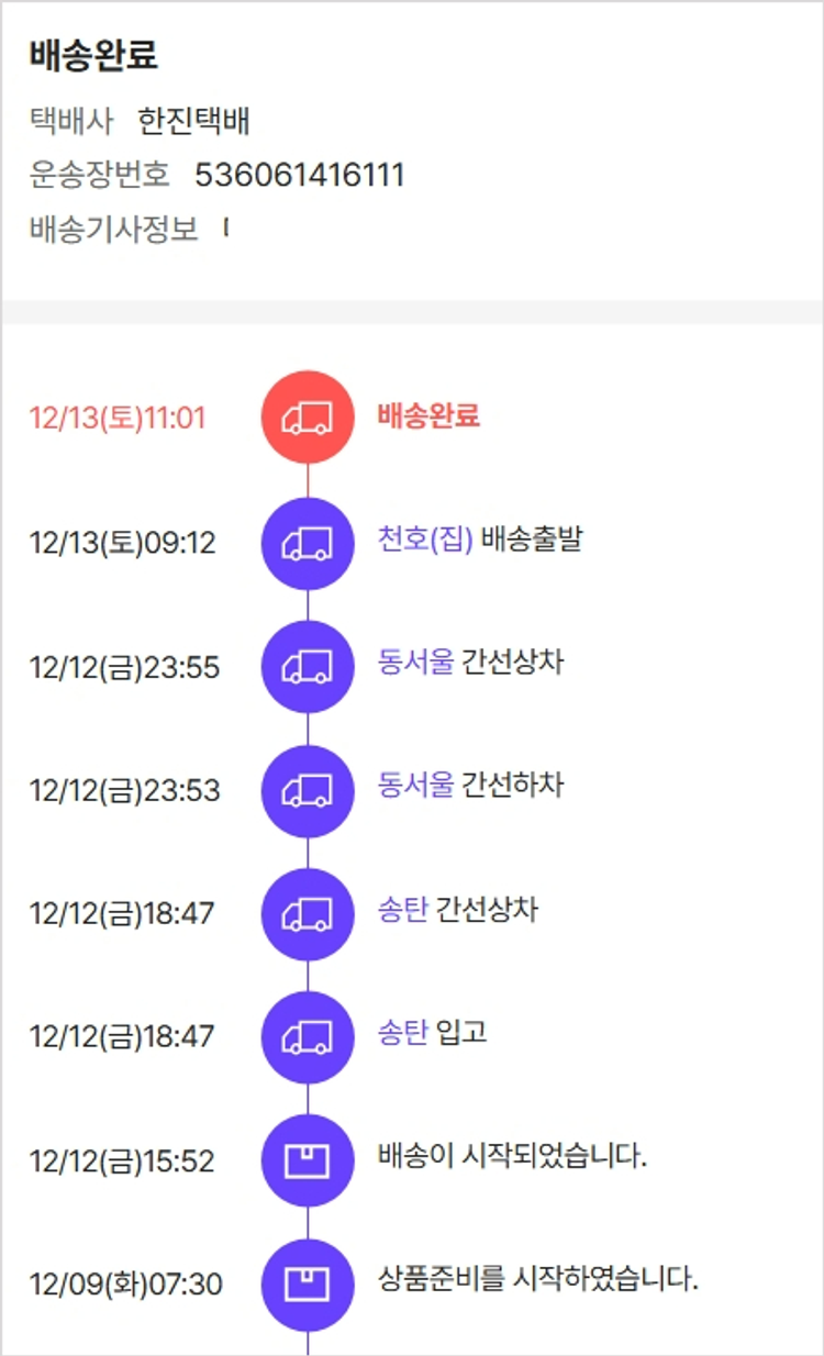 기부자님이 사용한 기부포인트 3,100원, 가격상승분 7,470원, 100원 미만 지원금 40원, 결제 수수료 11,051원, 기타 사업비는 행복나눔재단이 부담했습니다. (기부후기 발송시점에 최종 업데이트 됩니다.) 실제 쇼핑몰에서 확인되는 배송현황을 캡처한 내용입니다. 실시간 자료와는 차이가 있을 수 있습니다.