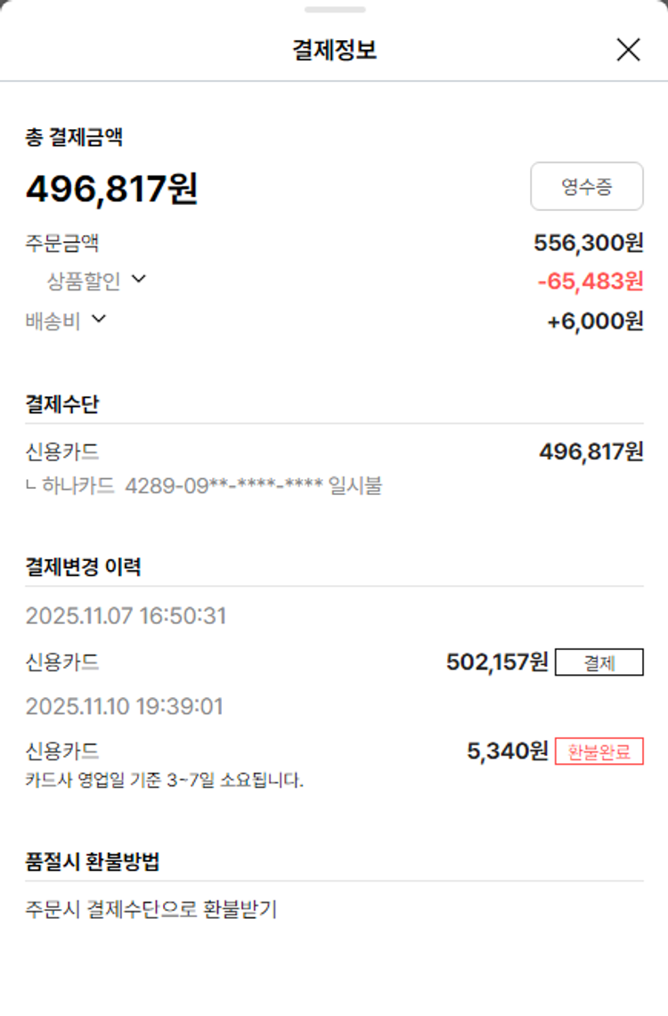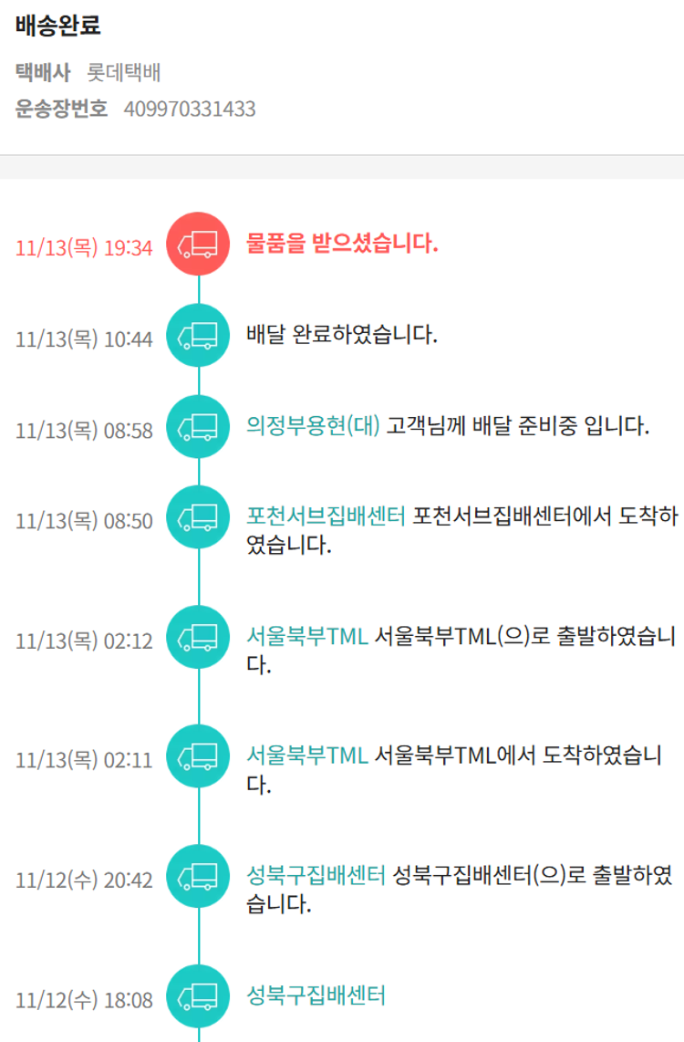기부자님이 사용한 기부포인트 1,900원, 물품배송비 8,500원, 가격상승분 3,340원, 100원 미만 지원금 97원, 결제 수수료 10,510원, 기타 사업비는 행복나눔재단이 부담했습니다. (기부후기 발송시점에 최종 업데이트 됩니다.) 상품 주문 건 중 품절 발생하여 2025-11-12 재주문하였습니다. 실제 쇼핑몰에서 확인되는 배송현황을 캡처한 내용입니다. 실시간 자료와는 차이가 있을 수 있습니다.