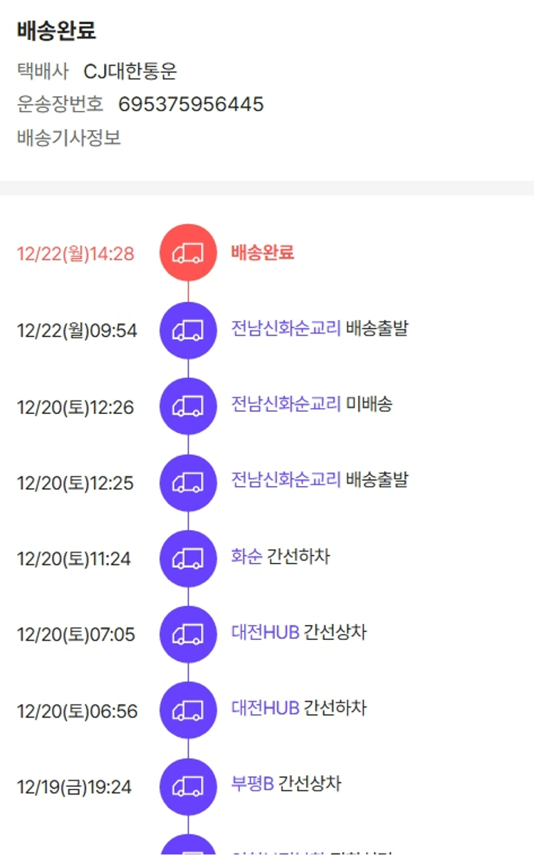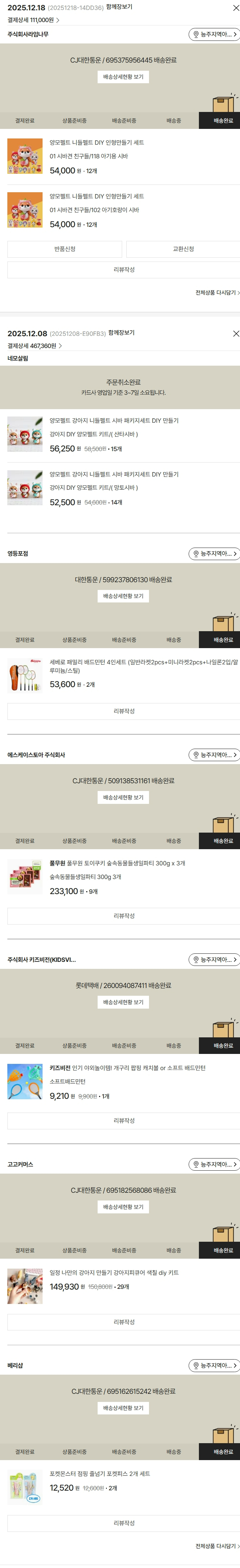 물품배송비 9,000원, 가격상승분 8,370원, 100원 미만 지원금 90원, 결제 수수료 12,091원, 기타 사업비는 행복나눔재단이 부담했습니다. (기부후기 발송시점에 최종 업데이트 됩니다.) 상품 주문 건 중 품절 발생하여 2025-12-18 재주문하였습니다. 실제 쇼핑몰에서 확인되는 배송현황을 캡처한 내용입니다. 실시간 자료와는 차이가 있을 수 있습니다.