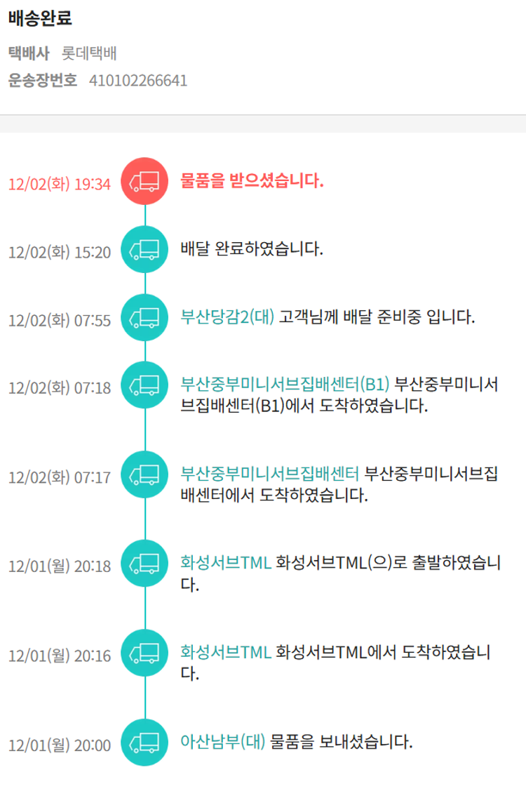 기부자님이 사용한 기부포인트 112,950원, 물품배송비 11,500원, 가격상승분 3,233원, 100원 미만 지원금 47원, 결제 수수료 9,873원, 기타 사업비는 행복나눔재단이 부담했습니다. (기부후기 발송시점에 최종 업데이트 됩니다.) 실제 쇼핑몰에서 확인되는 배송현황을 캡처한 내용입니다. 실시간 자료와는 차이가 있을 수 있습니다.