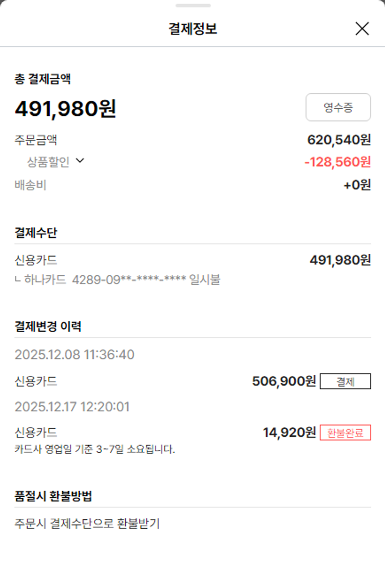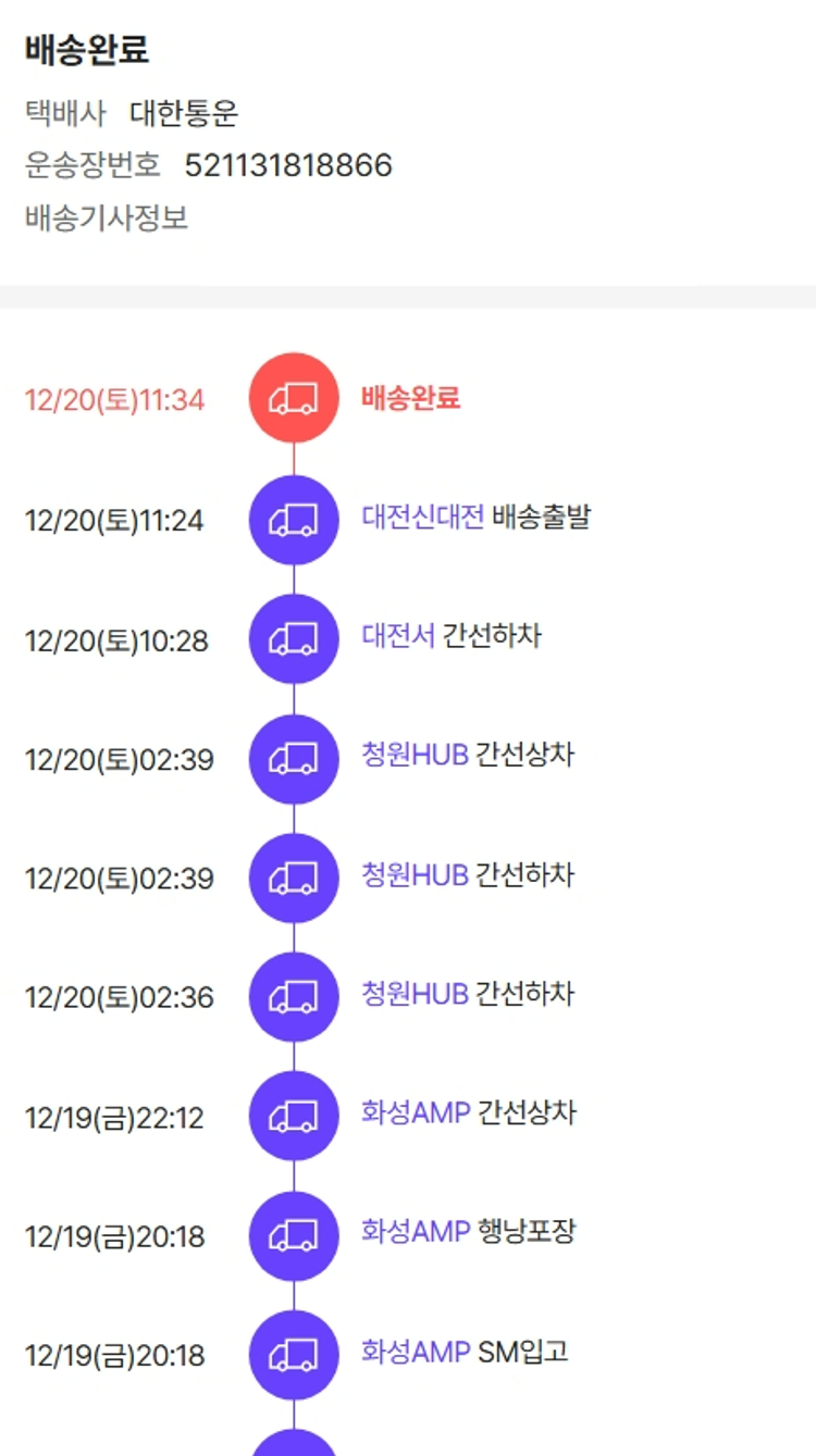물품배송비 6,000원, 가격상승분 12,900원, 100원 미만 지원금 80원, 결제 수수료 12,773원, 기타 사업비는 행복나눔재단이 부담했습니다. (기부후기 발송시점에 최종 업데이트 됩니다.) 상품 주문 건 중 품절 발생하여 2025-12-17 재주문하였습니다. 실제 쇼핑몰에서 확인되는 배송현황을 캡처한 내용입니다. 실시간 자료와는 차이가 있을 수 있습니다.