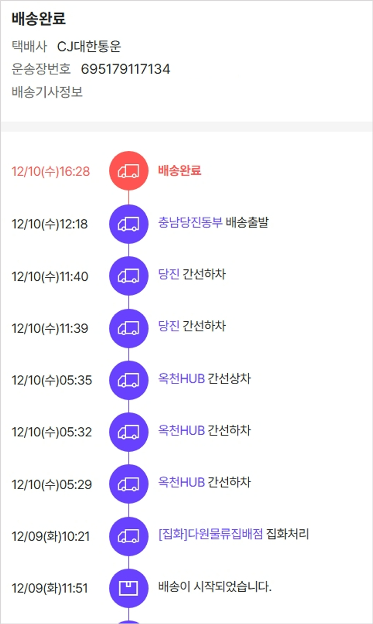 기부자님이 사용한 기부포인트 5,950원, 가격상승분 9,240원, 100원 미만 지원금 20원, 결제 수수료 10,660원, 기타 사업비는 행복나눔재단이 부담했습니다. (기부후기 발송시점에 최종 업데이트 됩니다.) 실제 쇼핑몰에서 확인되는 배송현황을 캡처한 내용입니다. 실시간 자료와는 차이가 있을 수 있습니다.