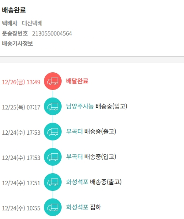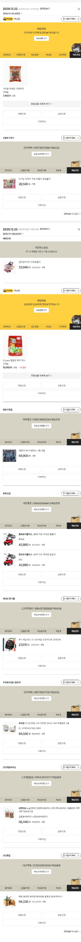 기부자님이 사용한 기부포인트 700원, 물품배송비 10,000원, 가격상승분 2,810원, 100원 미만 지원금 70원, 결제 수수료 10,946원, 기타 사업비는 행복나눔재단이 부담했습니다. (기부후기 발송시점에 최종 업데이트 됩니다.) 상품 주문 건 중 품절 발생하여 2025-12-22 재주문하였습니다. 실제 쇼핑몰에서 확인되는 배송현황을 캡처한 내용입니다. 실시간 자료와는 차이가 있을 수 있습니다.