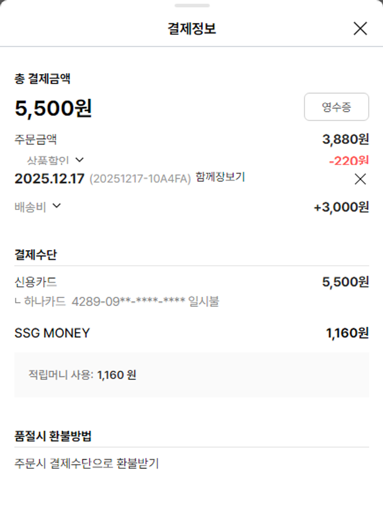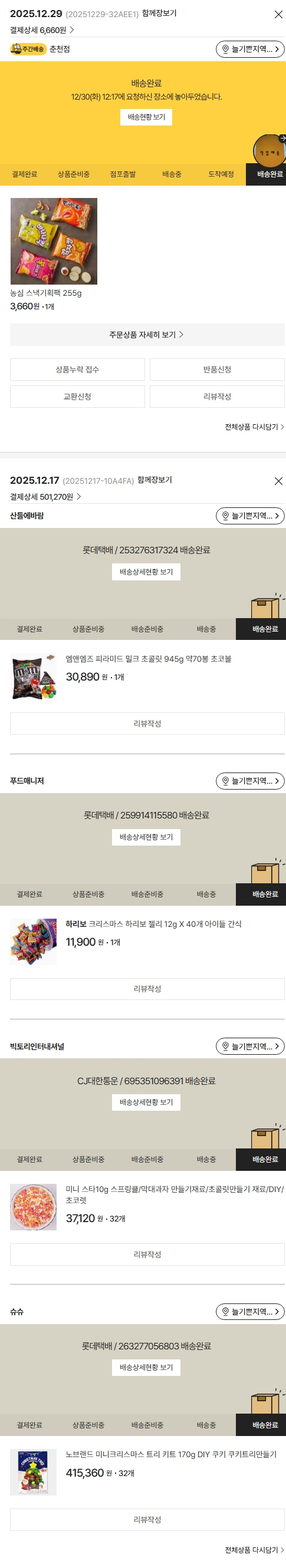 기부자님이 사용한 기부포인트 2,400원, 물품배송비 9,000원, 가격상승분 11,200원, 100원 미만 지원금 70원, SSG 머니 1,160포인트, 결제 수수료 10,707원, 기타 사업비는 행복나눔재단이 부담했습니다. (기부후기 발송시점에 최종 업데이트 됩니다.) 상품 주문 건 중 누락 건 발생한 관계로 환불된 SSG머니 사용하여 2025-12-29 재주문하였습니다. 실제 쇼핑몰에서 확인되는 배송현황을 캡처한 내용입니다. 실시간 자료와는 차이가 있을 수 있습니다.