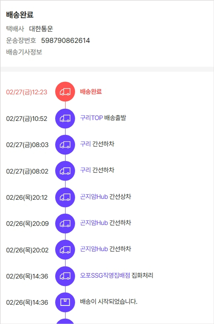 기부자님이 사용한 기부포인트 3,500원, 가격상승분 8,980원, 100원 미만 지원금 90원, 결제 수수료 14,131원, 기타 사업비는 행복나눔재단이 부담했습니다. (기부후기 발송시점에 최종 업데이트 됩니다.) 상품 주문 건 중 품절 발생하여 2026-02-23 재주문하였습니다. 실제 쇼핑몰에서 확인되는 배송현황을 캡처한 내용입니다. 실시간 자료와는 차이가 있을 수 있습니다.