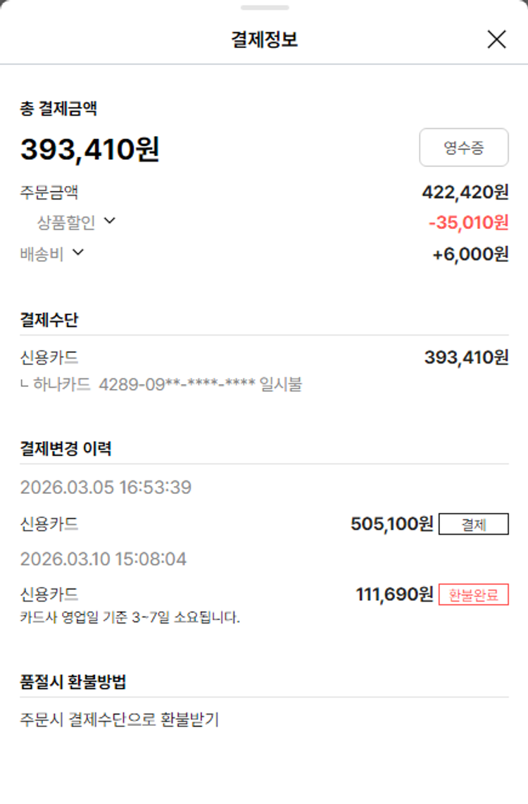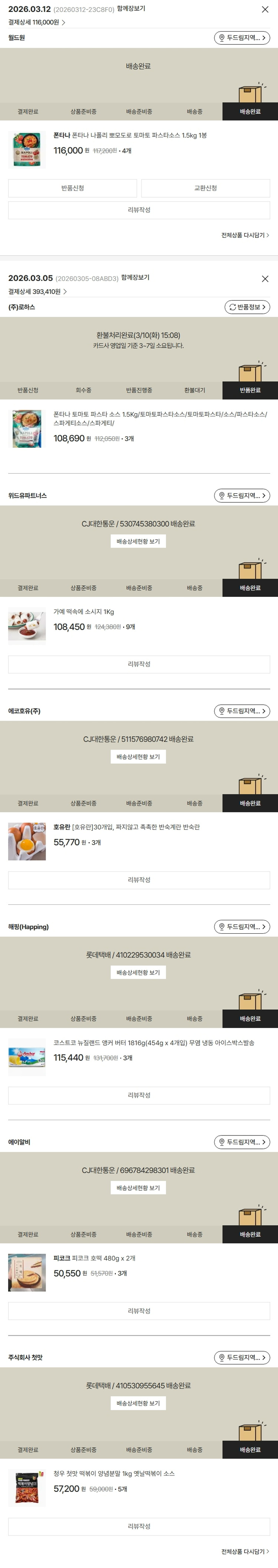 물품배송비 6,000원, 가격상승분 15,250원, 100원 미만 지원금 60원, 결제 수수료 11,289원, 기타 사업비는 행복나눔재단이 부담했습니다. (기부후기 발송시점에 최종 업데이트 됩니다.) 상품 주문 건 중 품절 발생하여 2026-03-12 재주문하였습니다. 실제 쇼핑몰에서 확인되는 배송현황을 캡처한 내용입니다. 실시간 자료와는 차이가 있을 수 있습니다.