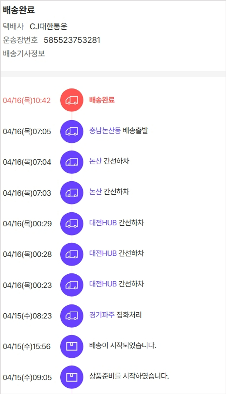 기부자님이 사용한 기부포인트 14,500원, 가격상승분 17,090원, 100원 미만 지원금 40원, 결제 수수료 12,034원, 기타 사업비는 행복나눔재단이 부담했습니다. (기부후기 발송시점에 최종 업데이트 됩니다.) 상품 주문 건 중 품절 발생하여 2026-04-15 재주문하였습니다. 실제 쇼핑몰에서 확인되는 배송현황을 캡처한 내용입니다. 실시간 자료와는 차이가 있을 수 있습니다.